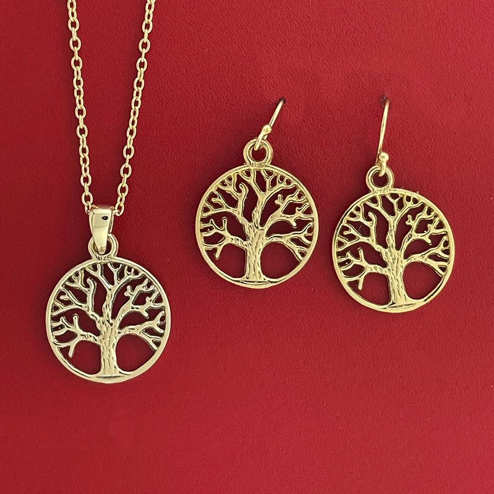 Sættet består af vores livets træ vedhæng, en forgyldt sølvkæde i 50 cm - plus et par ørehæng. Alt sammen i sterling sølv forgyldt i 18 karat guld.