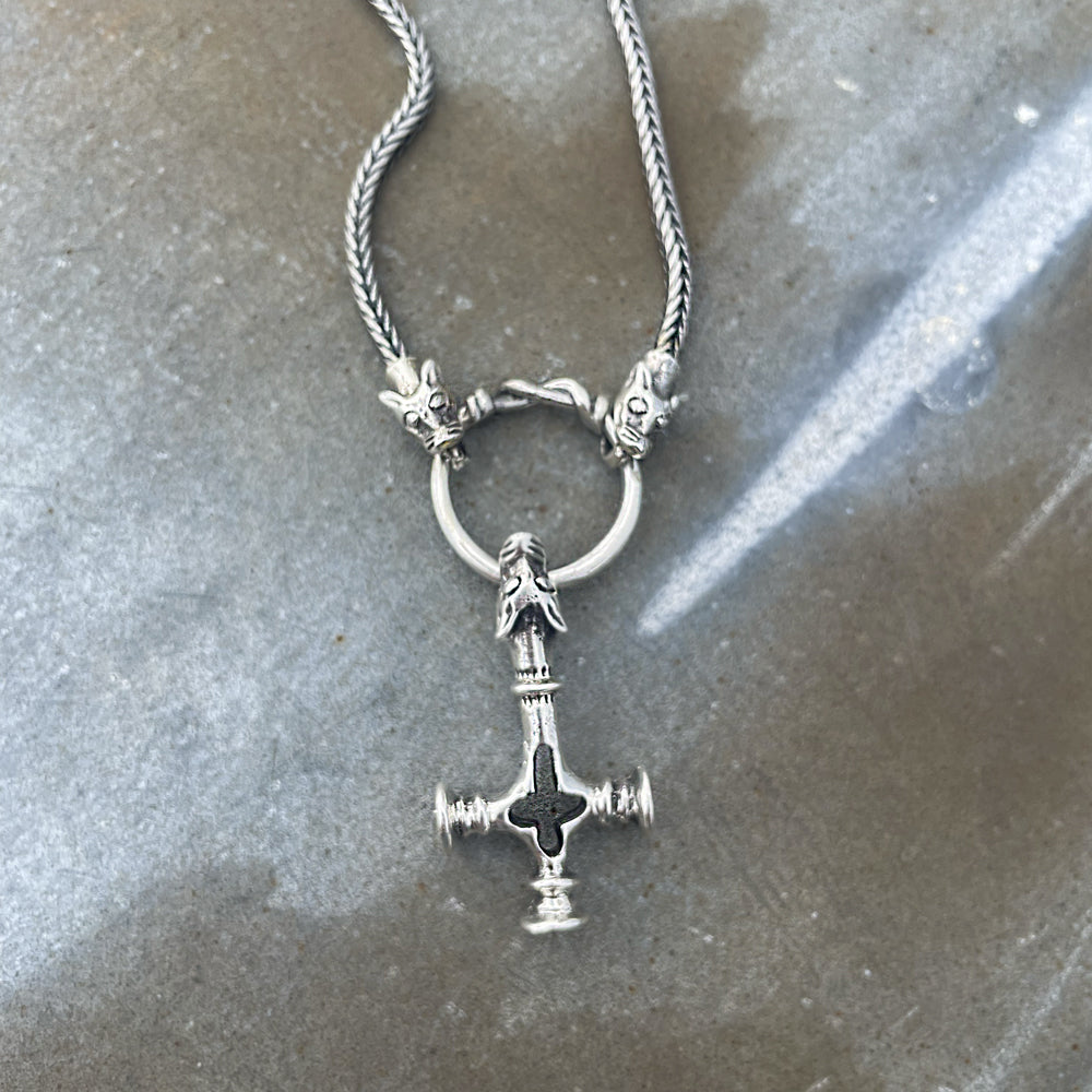 Et unikt vikingesmykke, hvor kraft og historie mødes. Vedhænget stammer fra et fund i Foss, Sydlandet/Island (900–1000-tallet) og er udstillet på Islands Nationalmuseum. Ulvehovedet symboliserer styrke og snuhed, mens korset i korset repræsenterer solens livskraft – en amulet båret for klogskab og energi.