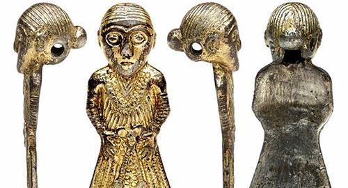 af vikingetidens guder, måske Frej eller Freja. Håret er samlet i en
