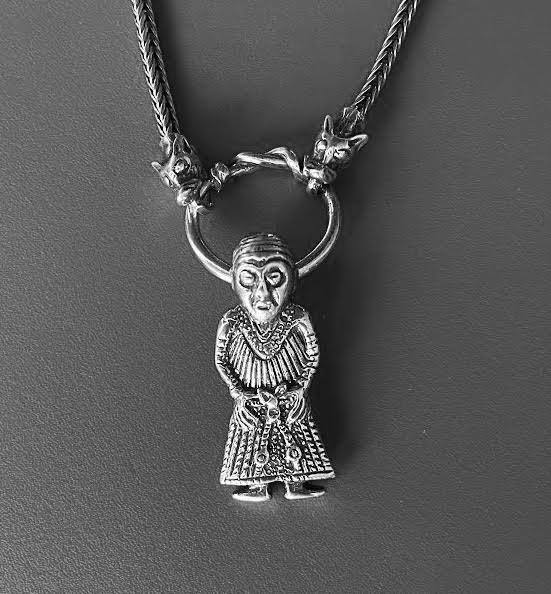 knude i nakken. Om halsen hænger en bred halskæde.