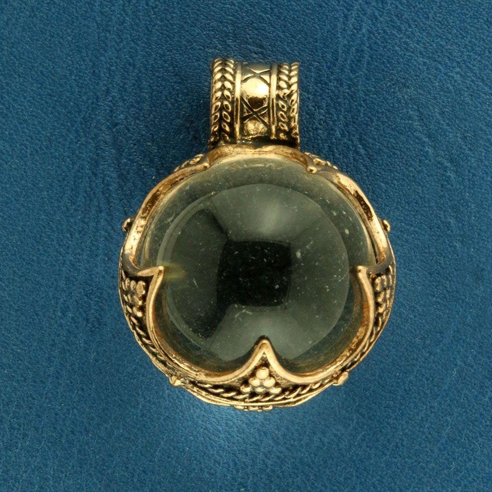 Dette vedhæng stammer fra en gotlandsk sølvskat fra vikingetiden, ca. 800 - 1.100 e. Kr. Udover at være båret som værdifulde smykker, har krystallerne sandsynligvis været