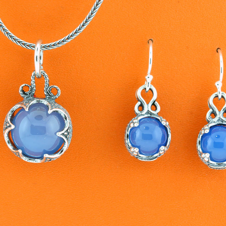 Gotlandsk Smykkesæt med vedhæng, RH16 kæde og ørehæng alt sammen i sterling sølv925 - i sættet er der en BLÅ agatsten indsat.