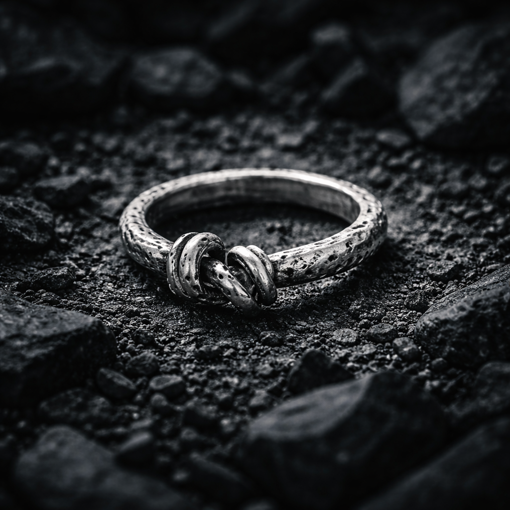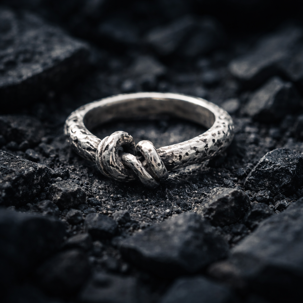 Denne rå knudering i sølv er et autentisk vikingeinspireret smykke, hvor knuder og snoringer uden ender symboliserer livets evige forandring – et vigtigt motiv i nordisk mytologi.