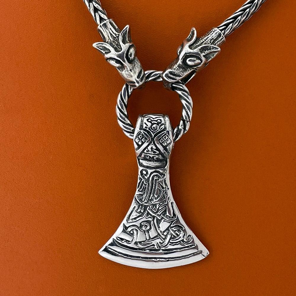 Et kraftfuldt smykke inspireret af et af vikingetidens mest berømte fund. Vedhænget (43 x 30 mm) er en genskabelse af den rigt udsmykkede økse fra Mammen, Jylland, dateret til ca. 850 e.Kr. Originalen, udført i jern med guld- og sølvdetaljer, bærer både runemotiver og dyreornamentik og er i dag udstillet på Danmarks Nationalmuseum.