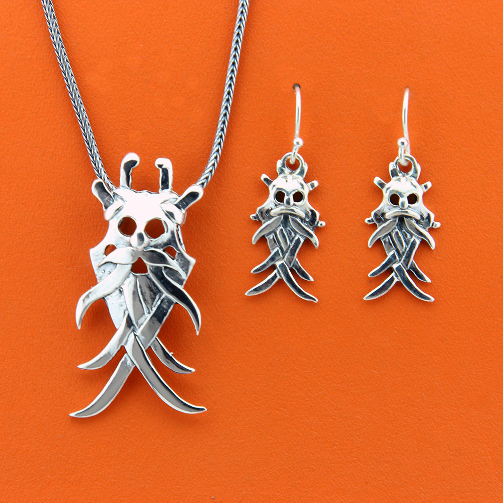 Her får du et samlet sæt af Odins masken fra Aarhus med maske-vedhæng, en rævehale halskæde og øreringe med masken - alt sammen i sølv.