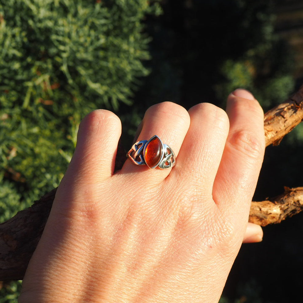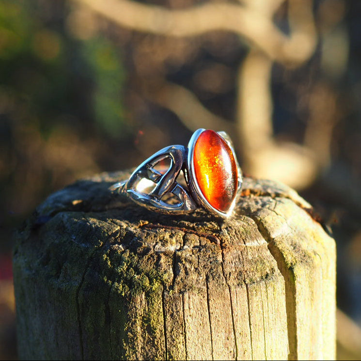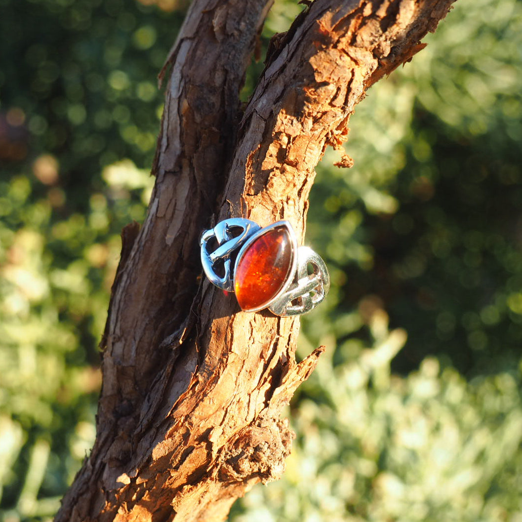 En smuk ring der kombinerer rav og sølv i et elegant mønster hvor ravet er centreret i ringens midte og omkranset af sølv-snoninger med inspiration fra de keltiske snoninger.