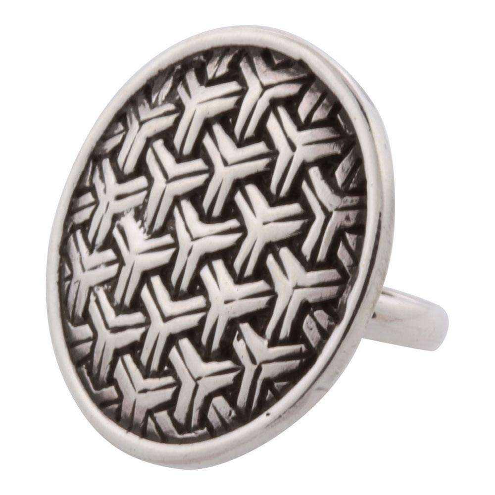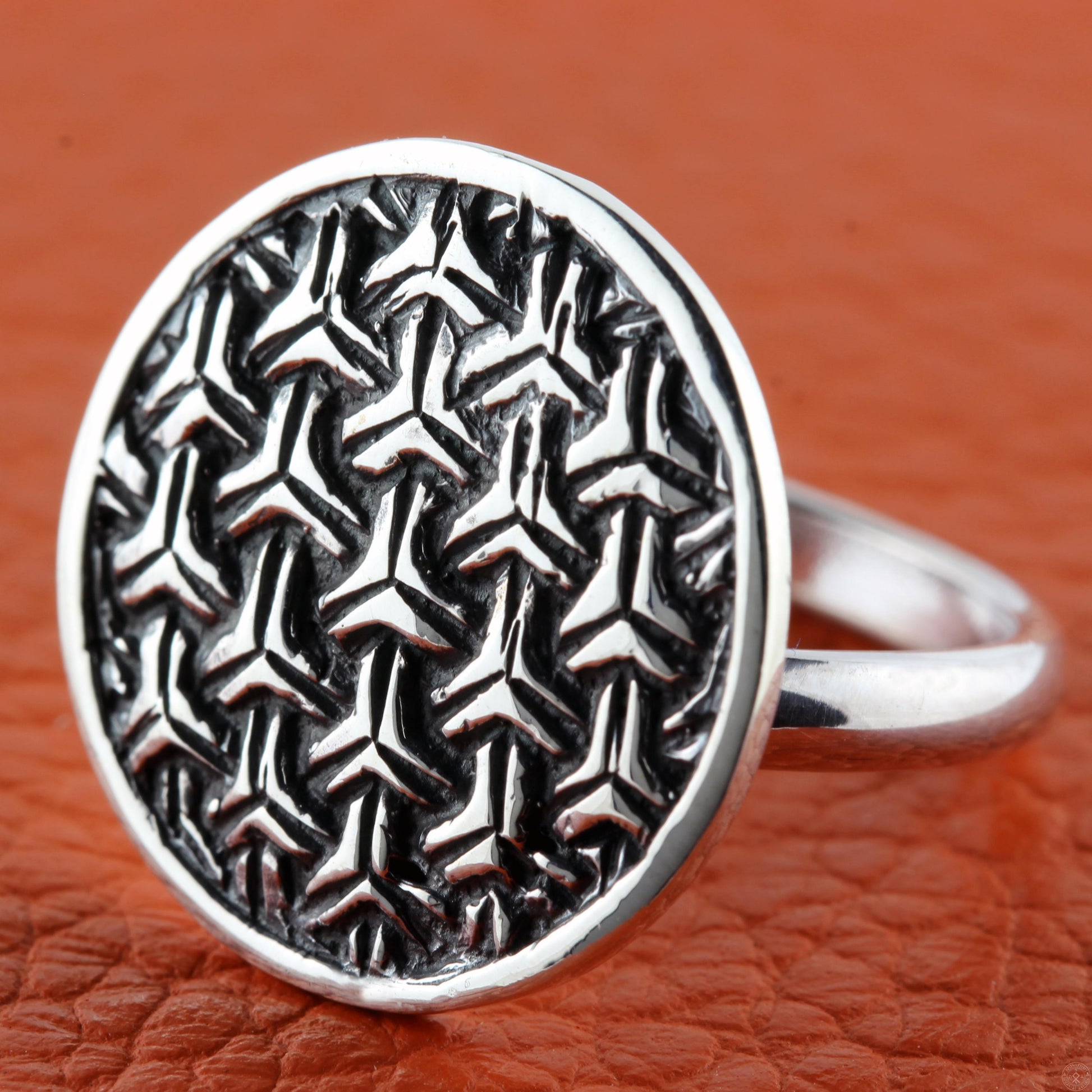 Sølvring med kædemønster i cirkel.