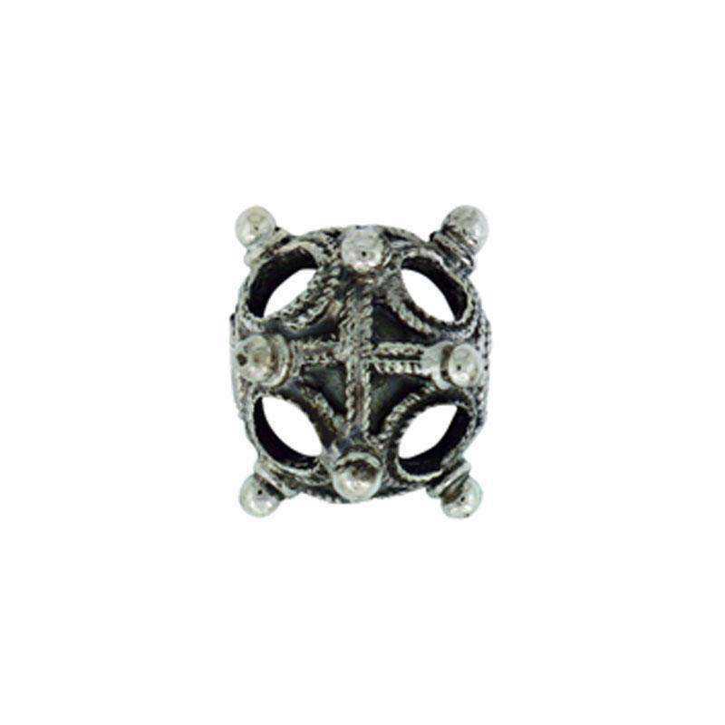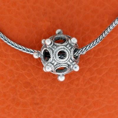 Den russiske Kreml-skat, gemt under krigshandlinger i 1238 og fundet igen i 1988, indeholdt bl.a. perler som denne, pyntet med filigran (snoet sølvwire). De sad på hovebeklædninger, kæder og øreringe.