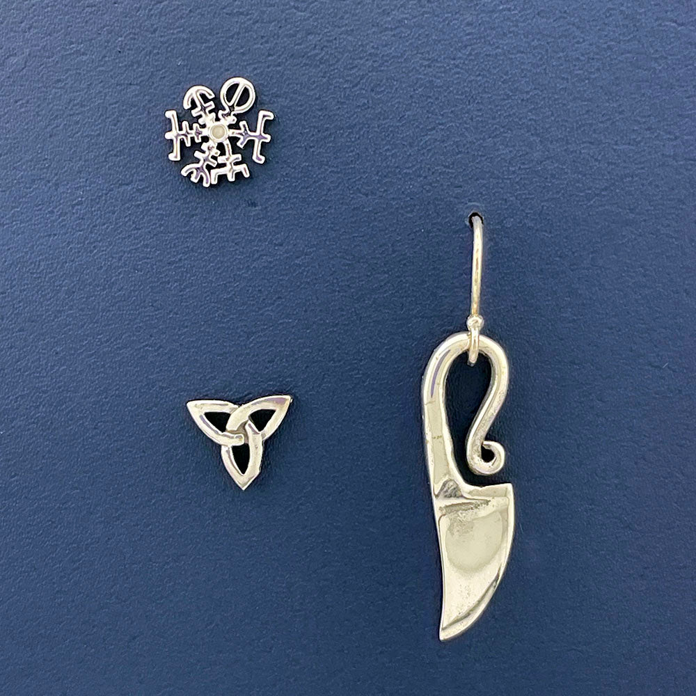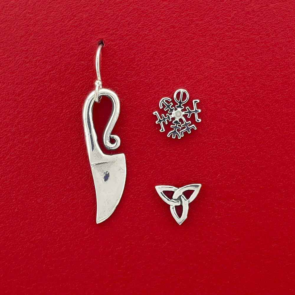 Sættet er sammensat med Kvindekniven, Runestaven med vejviseren og den keltiske knude uden ender. Alle sammen i sterling sølv (925)