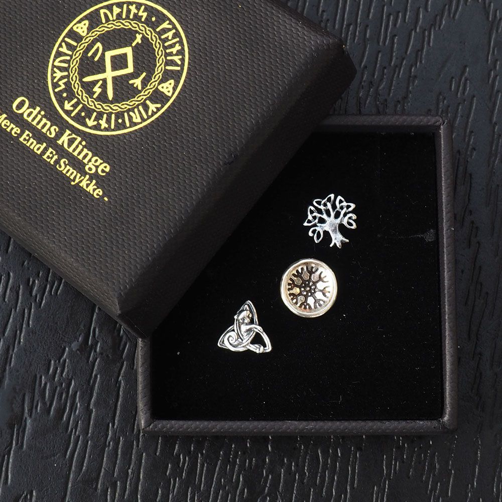 Her har du et unikt smykkesæt i sterling sølv 925, inspireret af de mest betydningsfulde symboler fra nordisk mytologi. Sættet indeholder tre forskellige ørestik, hver med sin egen fortælling:
