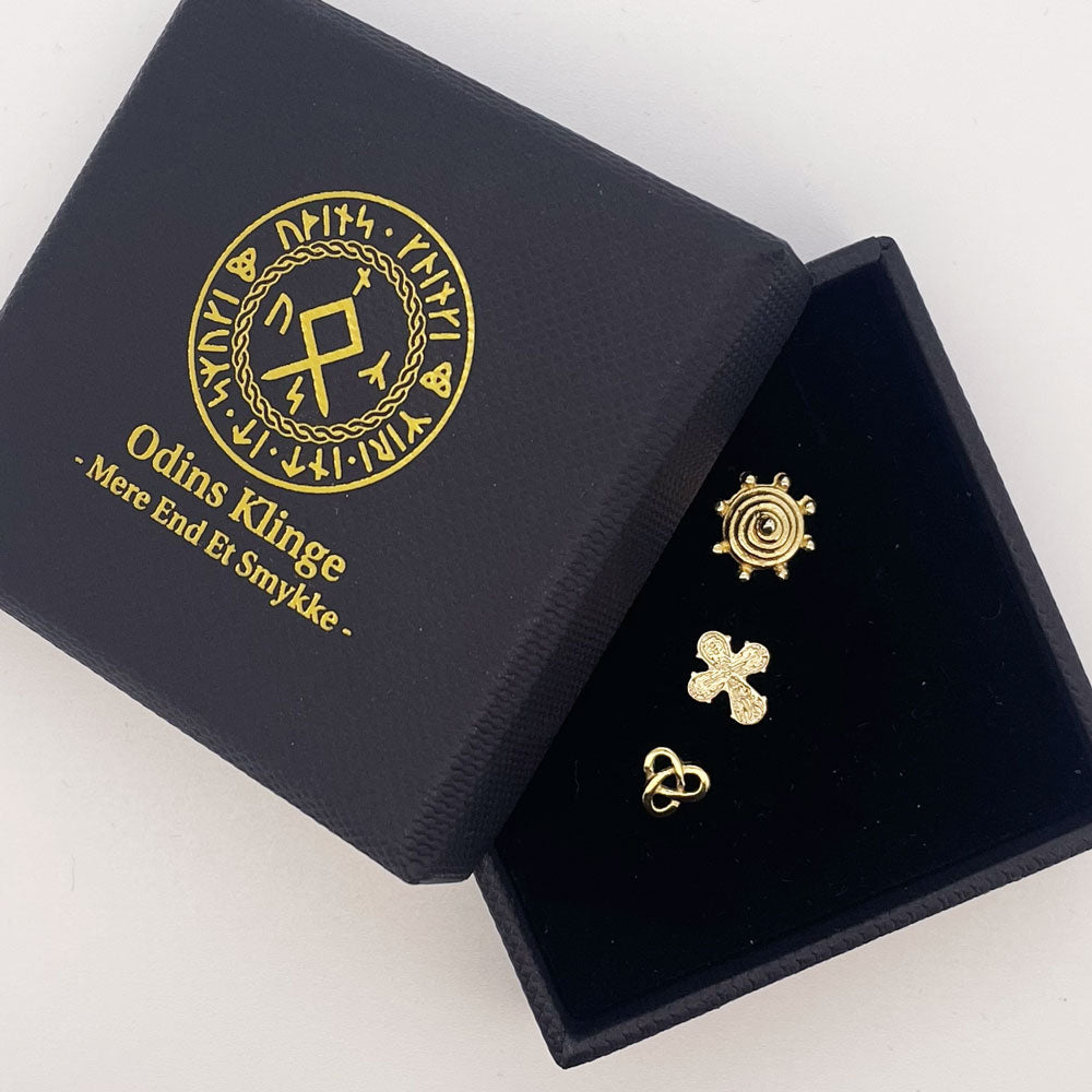 Oplev et unikt smykkesæt i forgyldt sterling sølv 925, der hylder nordisk historie og symbolik. Dette sæt indeholder tre forskellige ørestik, hver med sin egen historie og betydning: