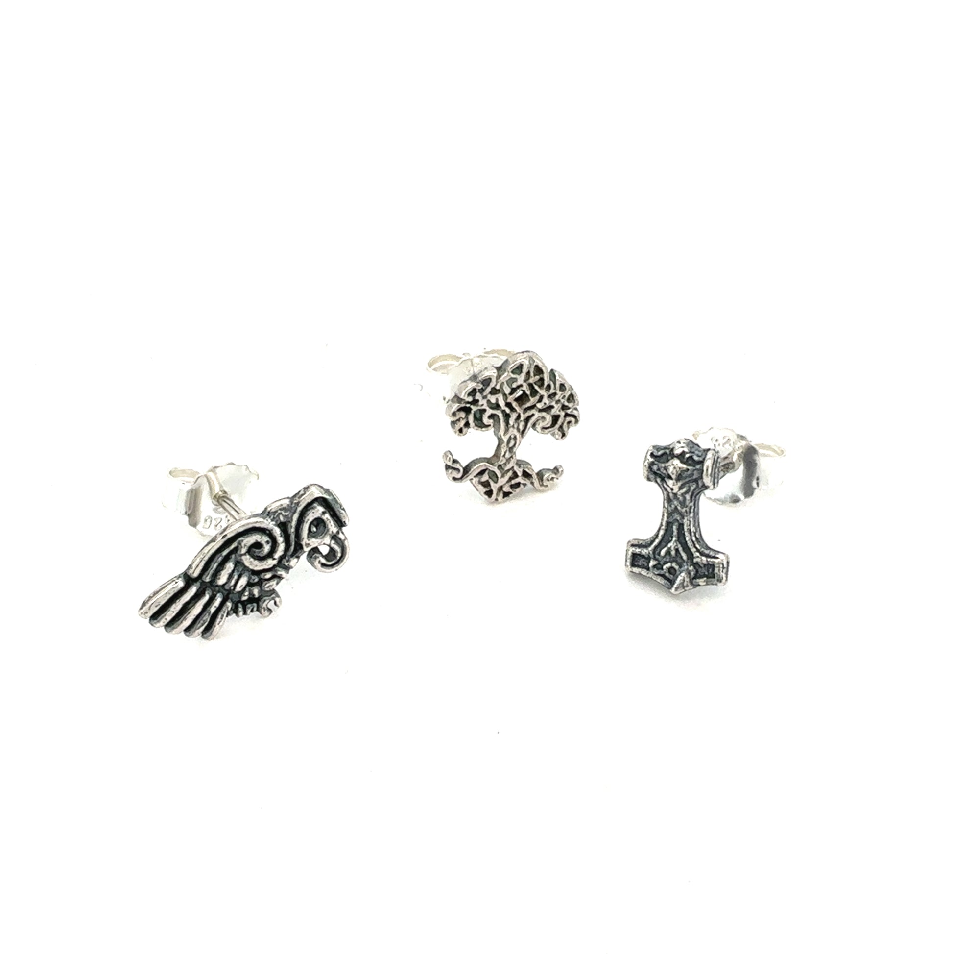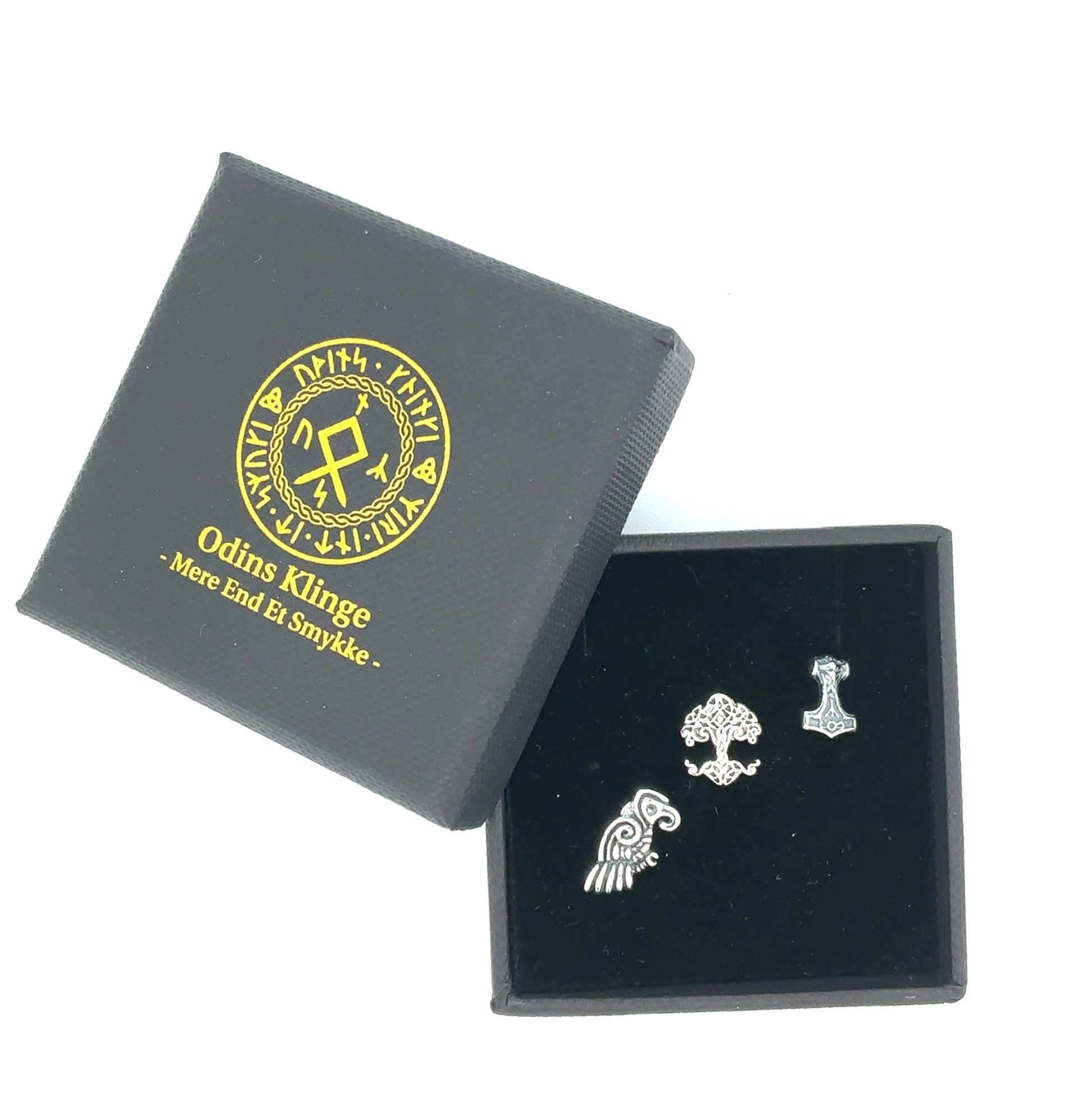 Her har du et unikt smykkesæt i sterling sølv 925, inspireret af de mest betydningsfulde symboler fra nordisk mytologi. Sættet indeholder tre forskellige ørestik, hver med sin egen fortælling: