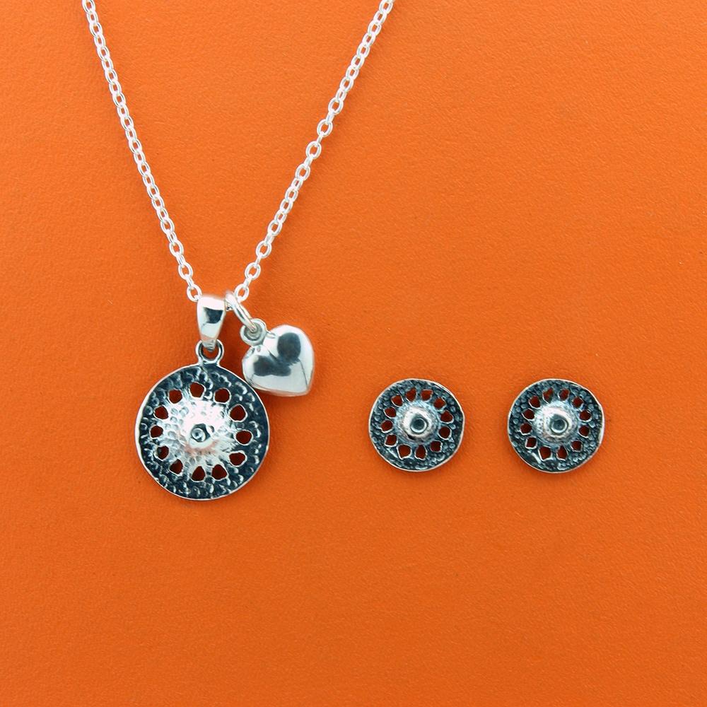 I smykkesmykket er der solhjulet vedhæng, et lille hjerte som vedhæng som hænger smukt samlet på en sølvkæde derudover er der et sæt ørestik med i pakken.