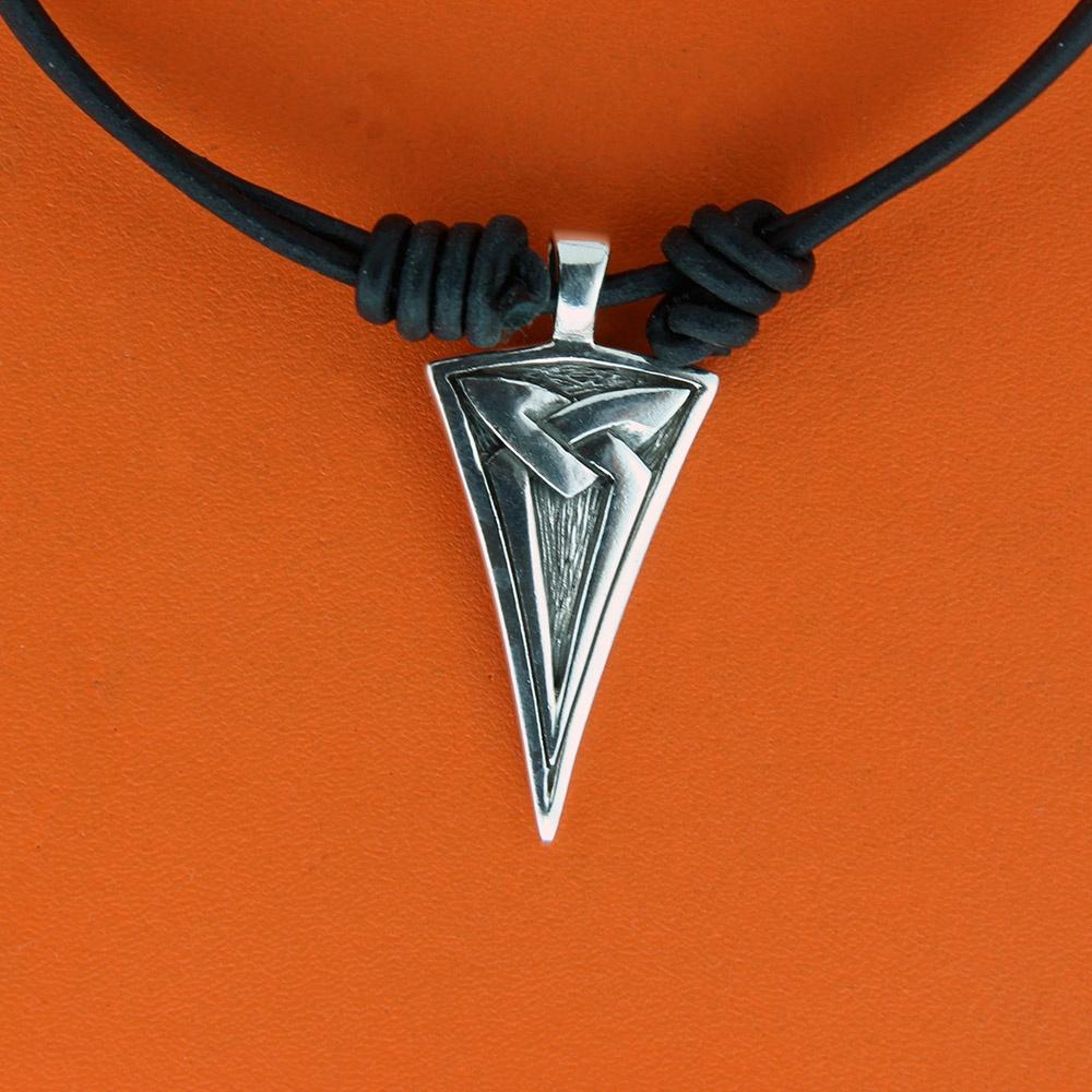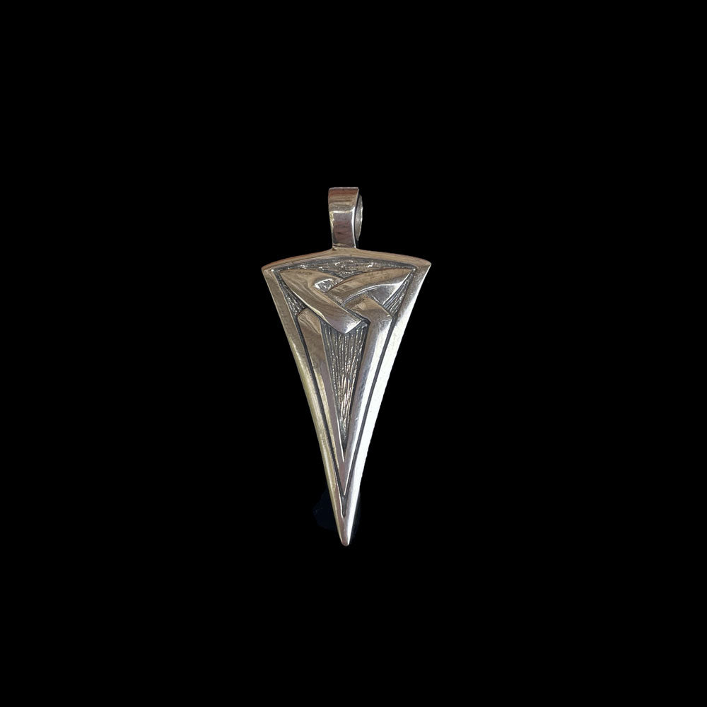 Vedænget er formet som et spydspis med keltiske snogninger. det er fremstillet i sterling sølv og måler 37mm x 17mm