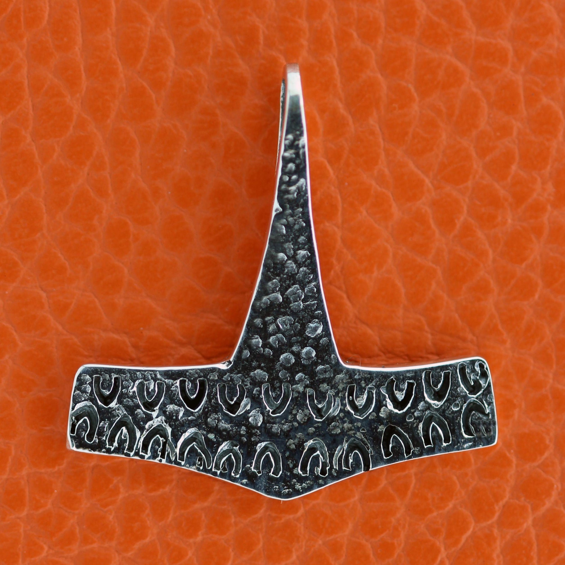Den blev båret af hedninge som bevis på deres tro på de gamle guder. Denne er hamret og pyntet med en slags vinkler.