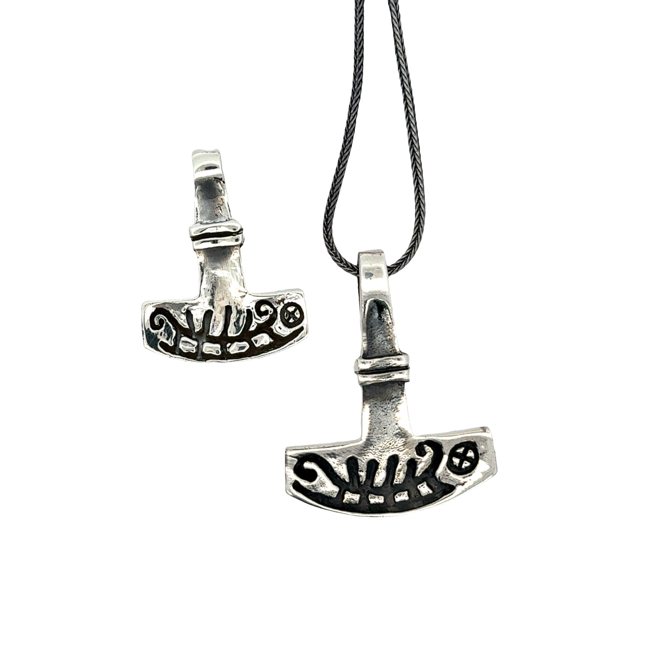 I dette smykke er helleristningen elegant integreret i Mjølner – et historisk møde mellem tiderne. Ifølge sagaerne blev hammeren smedet af dværgen Sindri og lammede fjenderne, men vendte altid tilbage til Thor, hvilket gjorde ham uovervindelig. Den blev båret af hedninge som tegn på tro på de gamle guder.