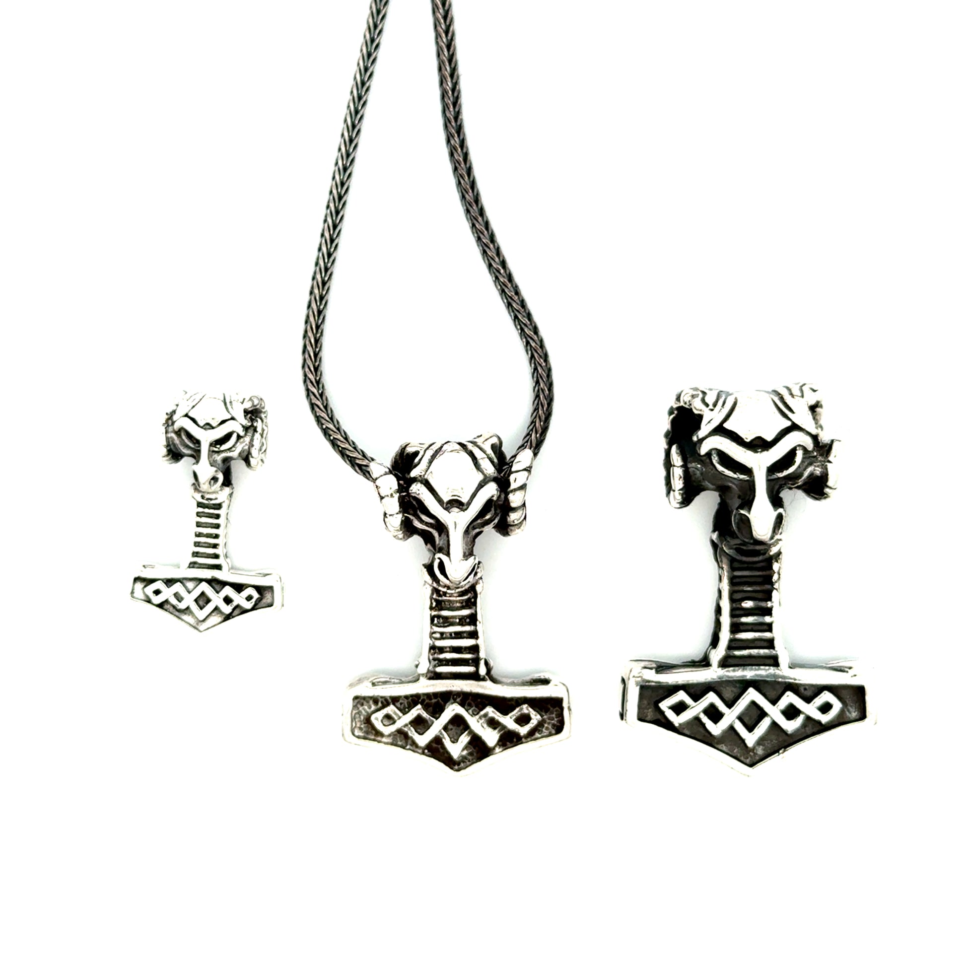 Bær kraften fra vikingetiden med Thors Hammer i sølv, dekoreret med et gedebuk-hoved – et symbol på styrke og uovervindelighed. Vedhænget fås i tre størrelser: