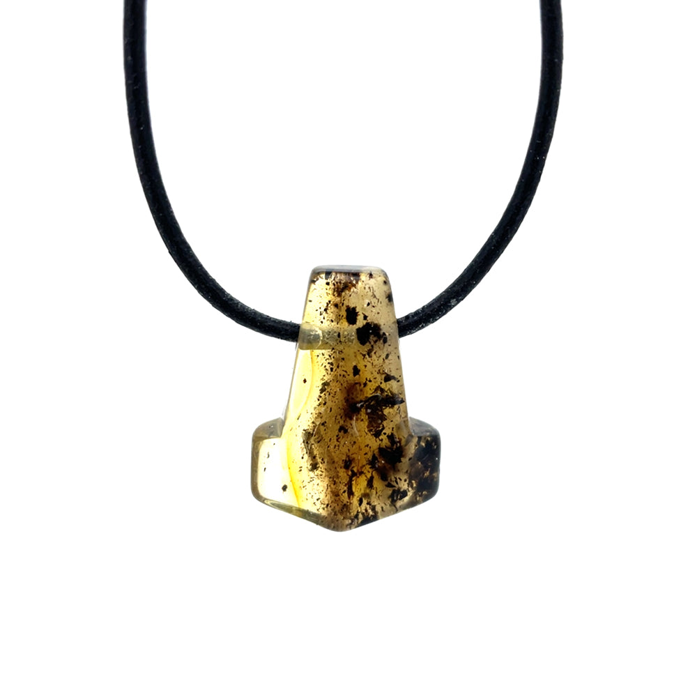 Dette enestående vedhæng er udformet som Thors Hammer og fremstillet af ægte rav. Med sin smukke glød og naturlige mønstre er det et unika, som ikke findes magen til.