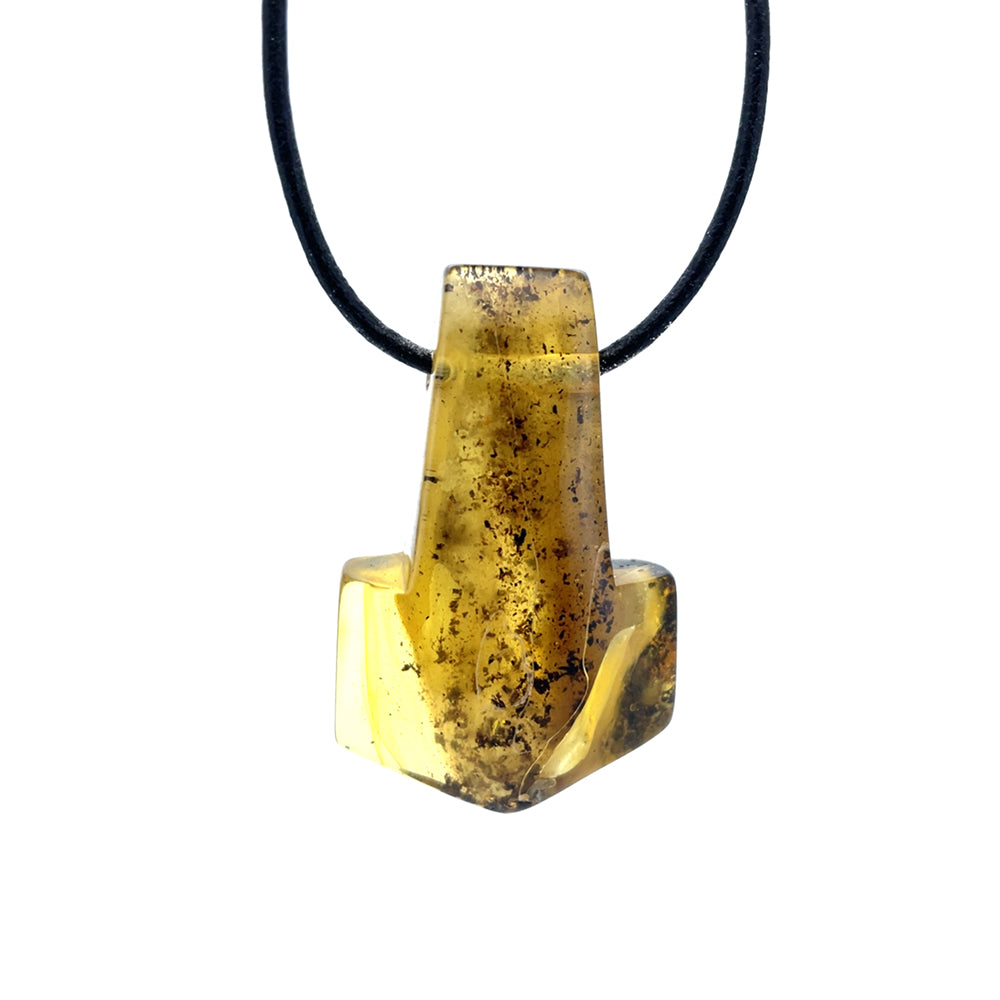Dette enestående vedhæng er udformet som Thors Hammer og fremstillet af ægte rav. Med sin smukke glød og naturlige mønstre er det et unika, som ikke findes magen til.