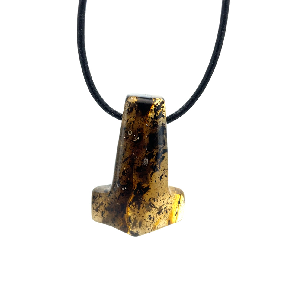 Dette enestående vedhæng er udformet som Thors Hammer og fremstillet af ægte rav. Med sin smukke glød og naturlige mønstre er det et unika, som ikke findes magen til.