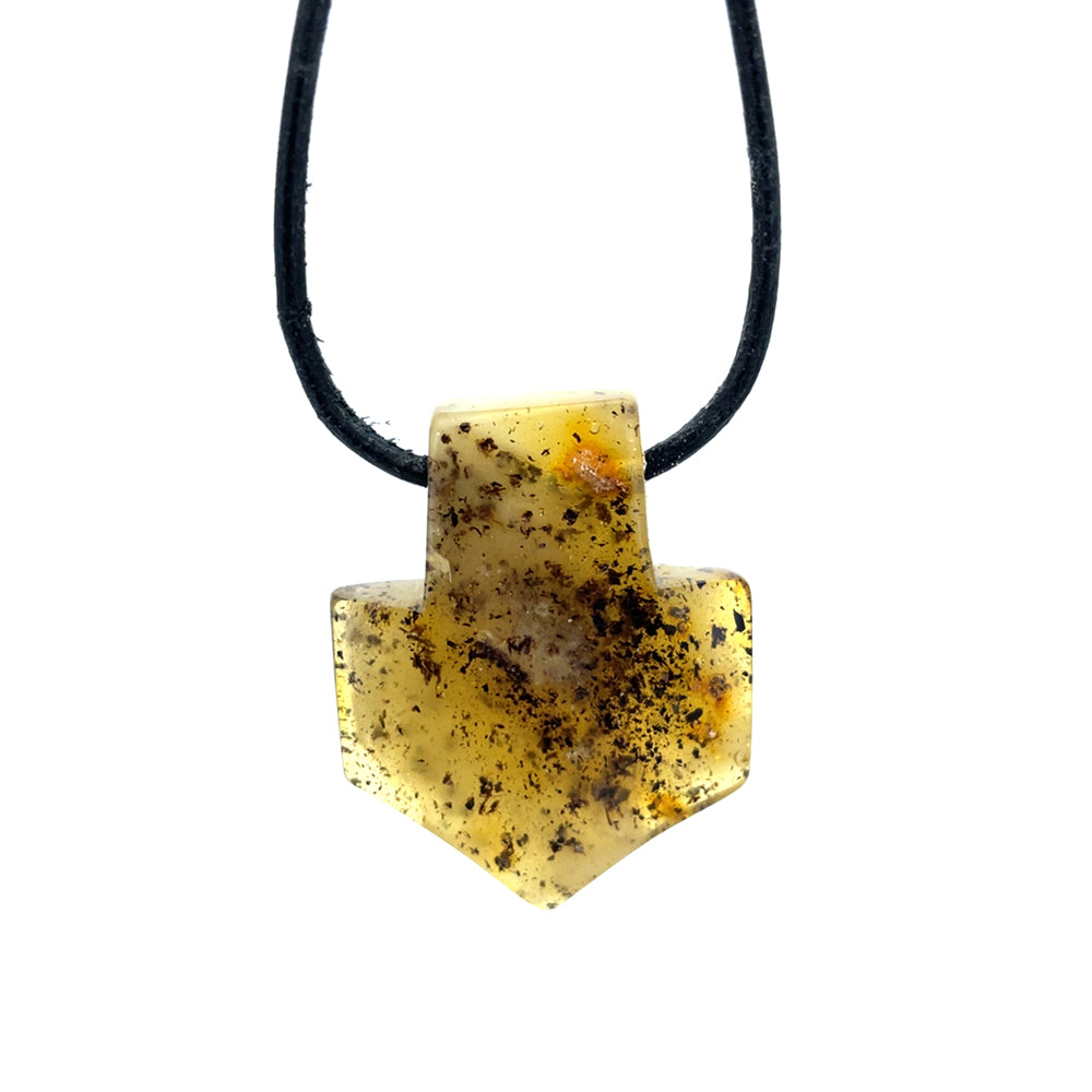 Dette enestående vedhæng er udformet som Thors Hammer og fremstillet af ægte rav. Med sin smukke glød og naturlige mønstre er det et unika, som ikke findes magen til.