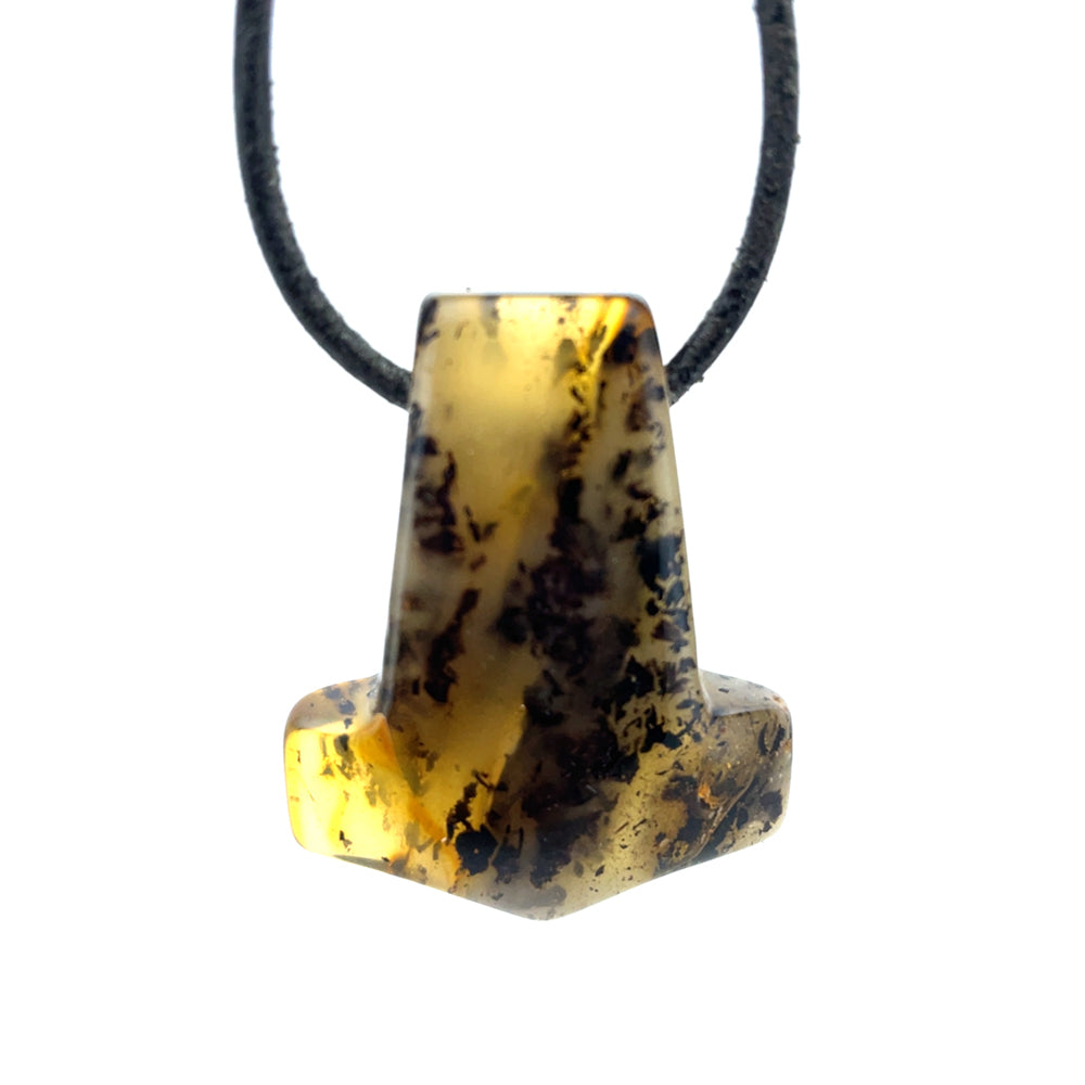 Dette enestående vedhæng er udformet som Thors Hammer og fremstillet af ægte rav. Med sin smukke glød og naturlige mønstre er det et unika, som ikke findes magen til.
