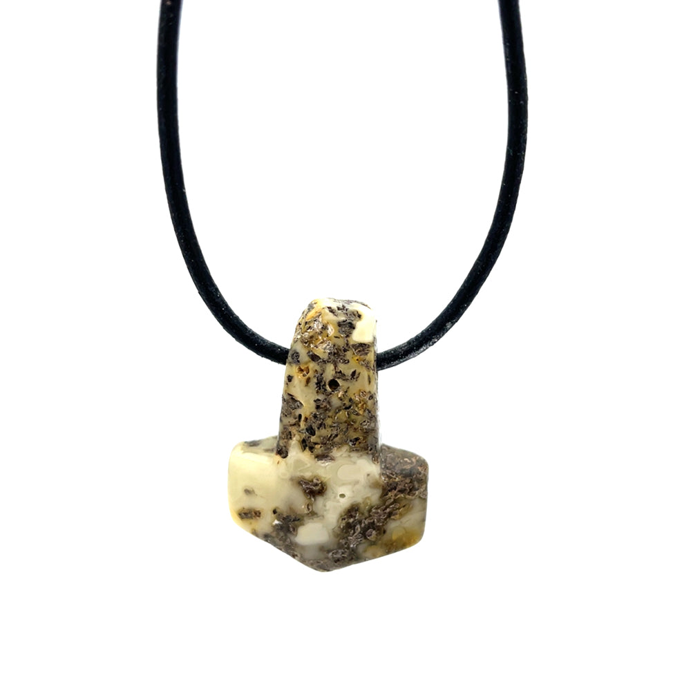 Dette enestående vedhæng er udformet som Thors Hammer og fremstillet af ægte rav. Med sin smukke glød og naturlige mønstre er det et unika, som ikke findes magen til.