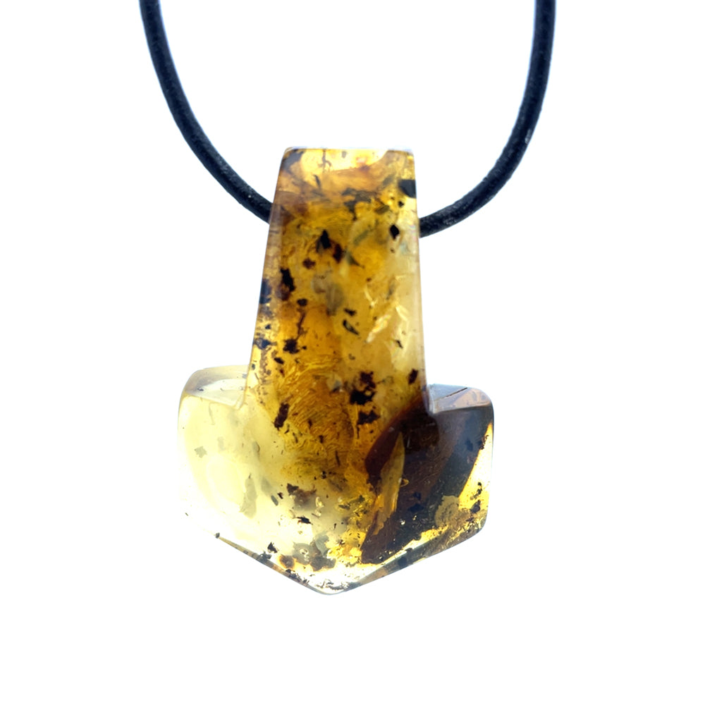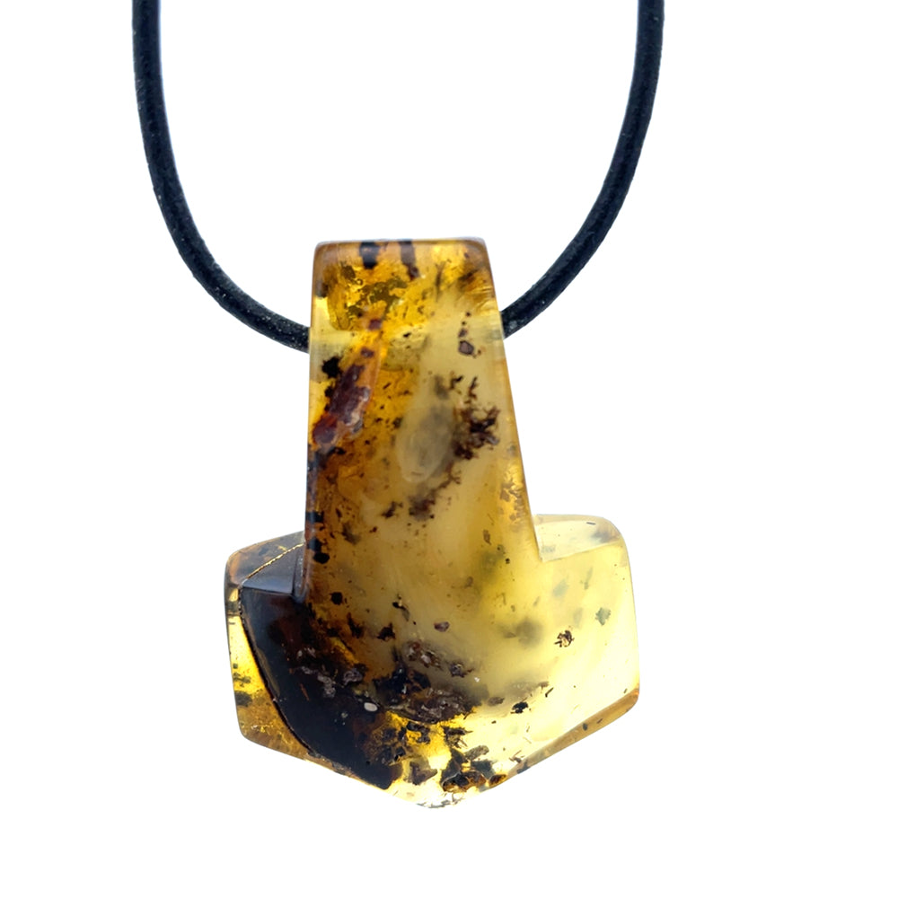 Dette enestående vedhæng er udformet som Thors Hammer og fremstillet af ægte rav. Med sin smukke glød og naturlige mønstre er det et unika, som ikke findes magen til.