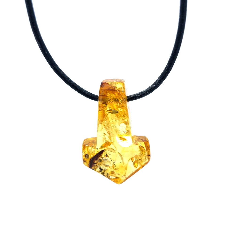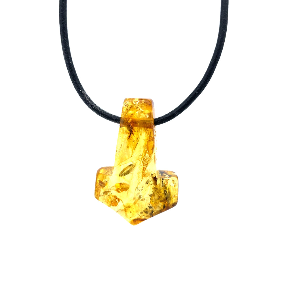 Dette enestående vedhæng er udformet som Thors Hammer og fremstillet af ægte rav. Med sin smukke glød og naturlige mønstre er det et unika, som ikke findes magen til.