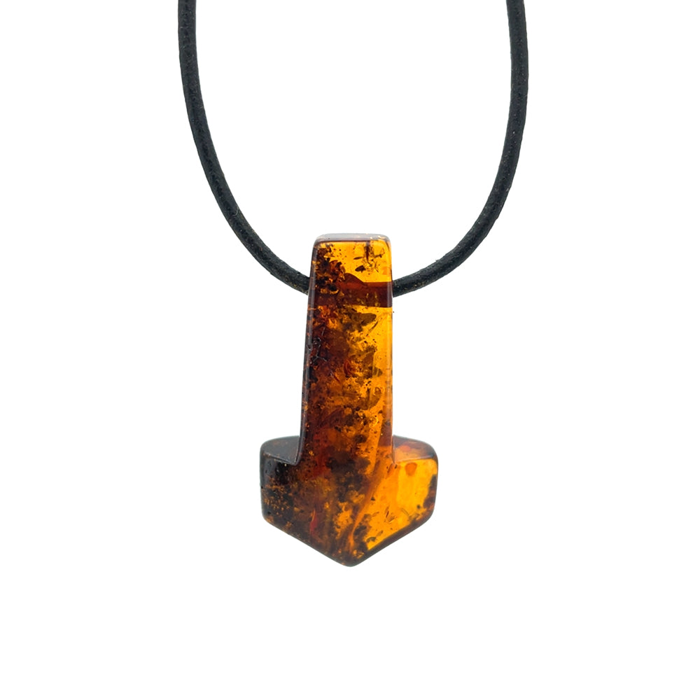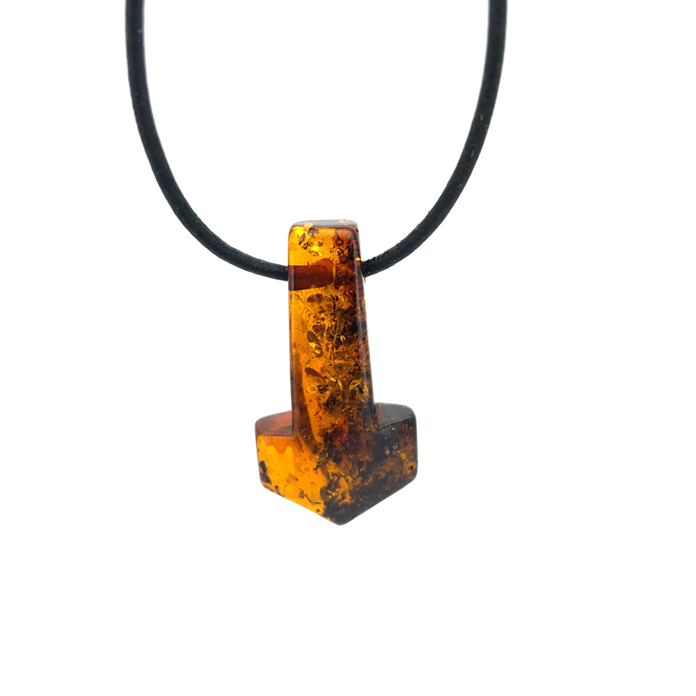Dette enestående vedhæng er udformet som Thors Hammer og fremstillet af ægte rav. Med sin smukke glød og naturlige mønstre er det et unika, som ikke findes magen til.