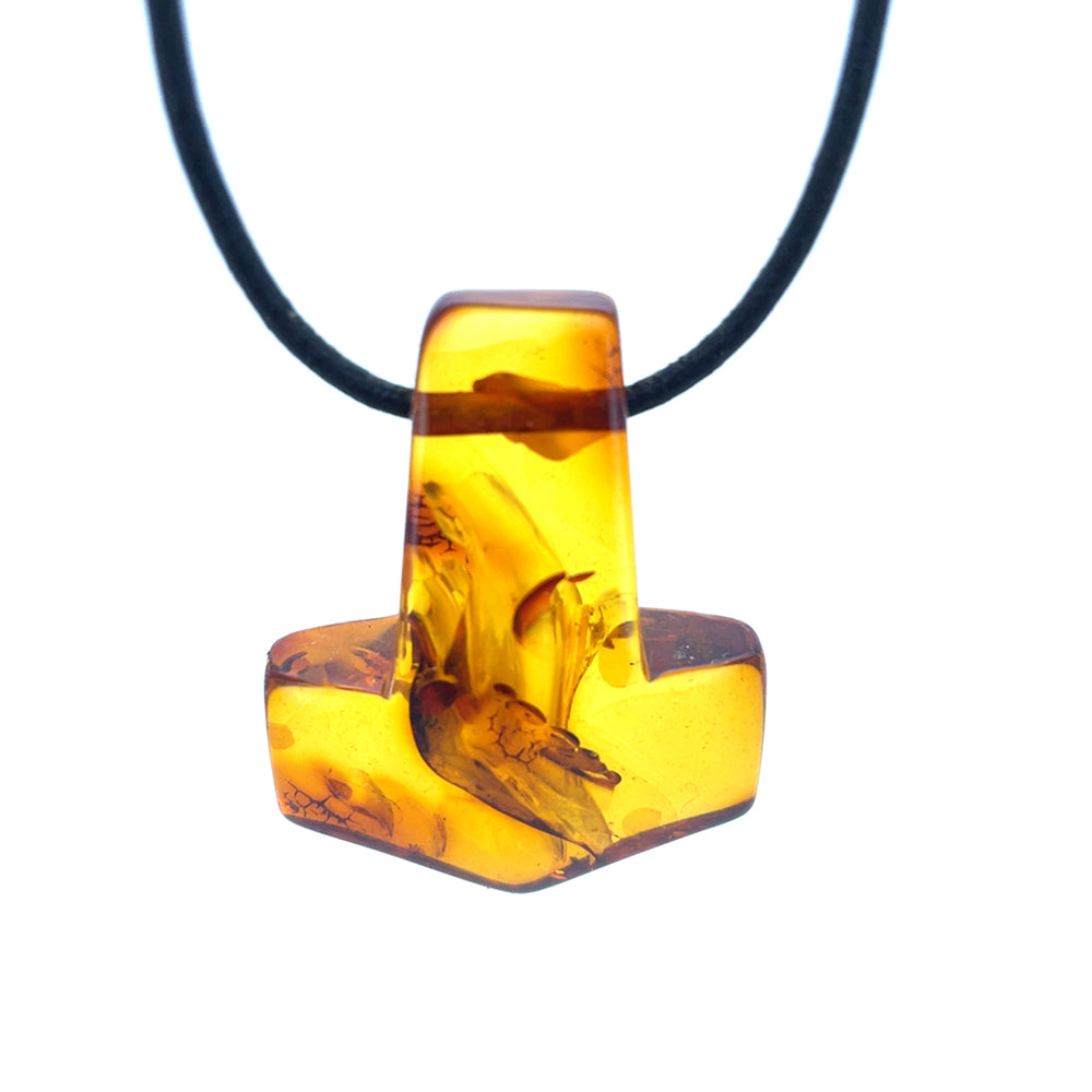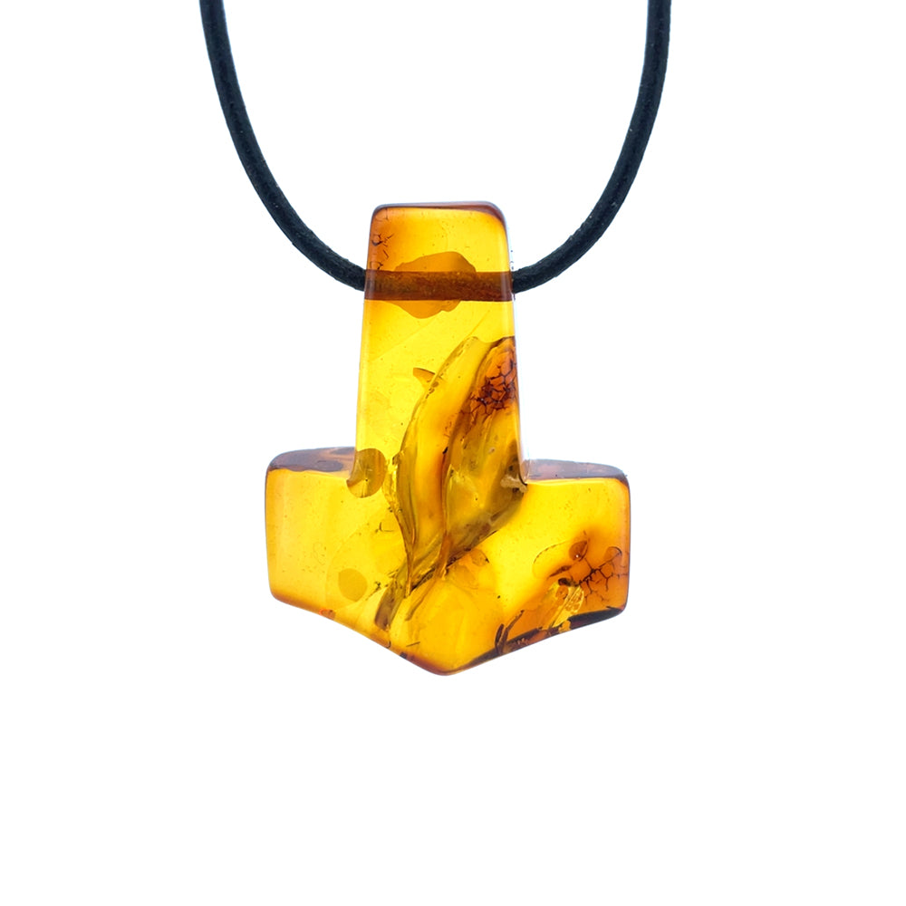Dette enestående vedhæng er udformet som Thors Hammer og fremstillet af ægte rav. Med sin smukke glød og naturlige mønstre er det et unika, som ikke findes magen til.