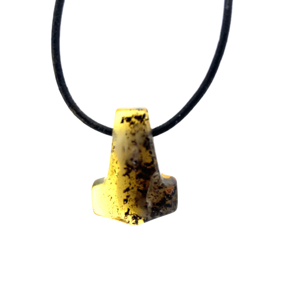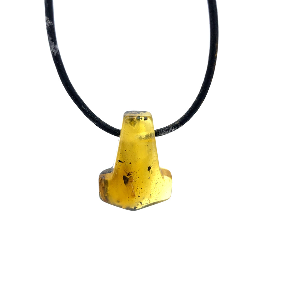 Dette enestående vedhæng er udformet som Thors Hammer og fremstillet af ægte rav. Med sin smukke glød og naturlige mønstre er det et unika, som ikke findes magen til.