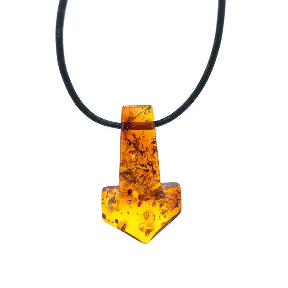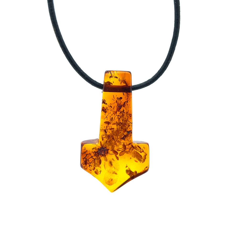 Dette enestående vedhæng er udformet som Thors Hammer og fremstillet af ægte rav. Med sin smukke glød og naturlige mønstre er det et unika, som ikke findes magen til.