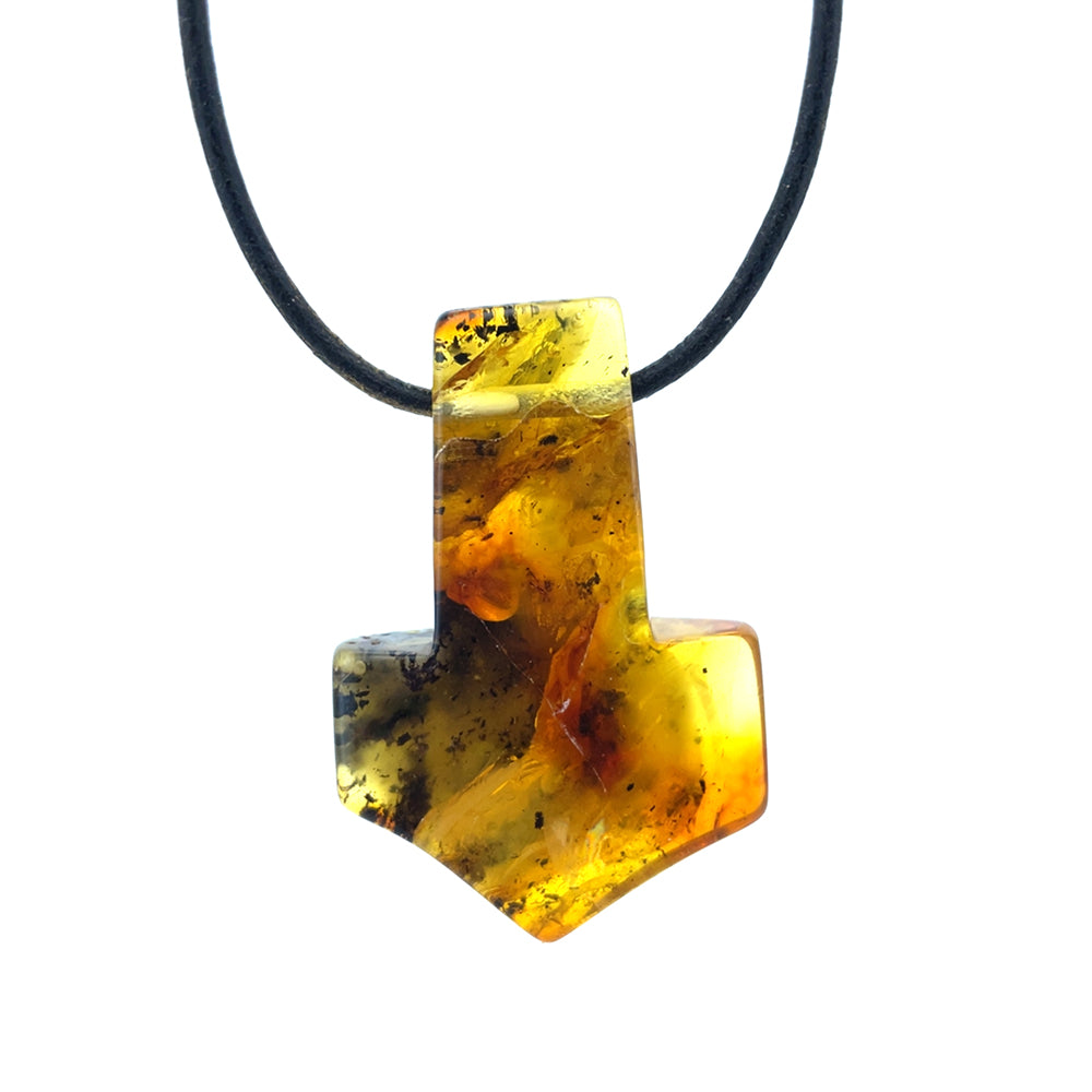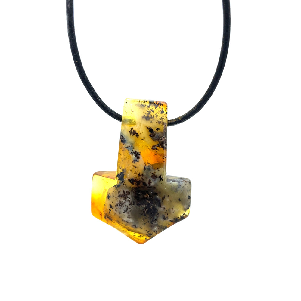 Dette enestående vedhæng er udformet som Thors Hammer og fremstillet af ægte rav. Med sin smukke glød og naturlige mønstre er det et unika, som ikke findes magen til.