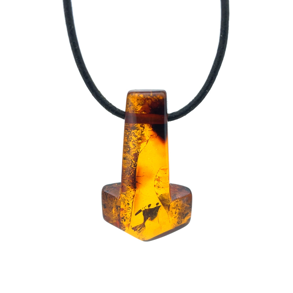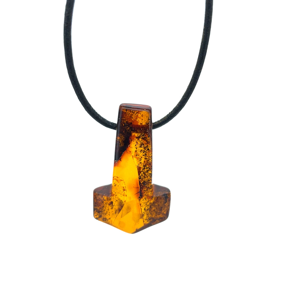 Dette enestående vedhæng er udformet som Thors Hammer og fremstillet af ægte rav. Med sin smukke glød og naturlige mønstre er det et unika, som ikke findes magen til.