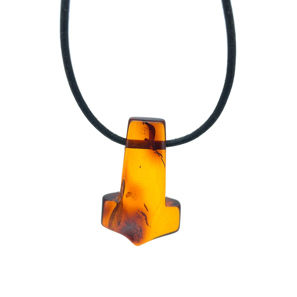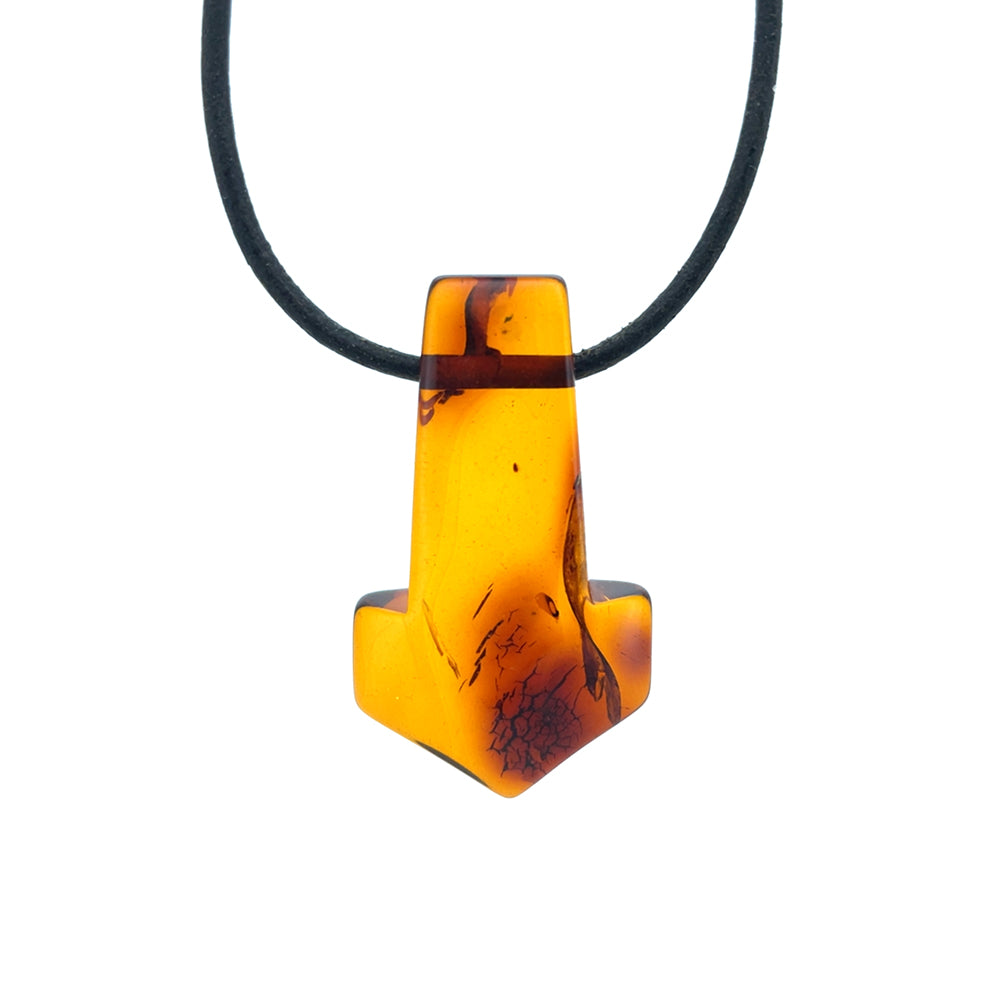 Dette enestående vedhæng er udformet som Thors Hammer og fremstillet af ægte rav. Med sin smukke glød og naturlige mønstre er det et unika, som ikke findes magen til.