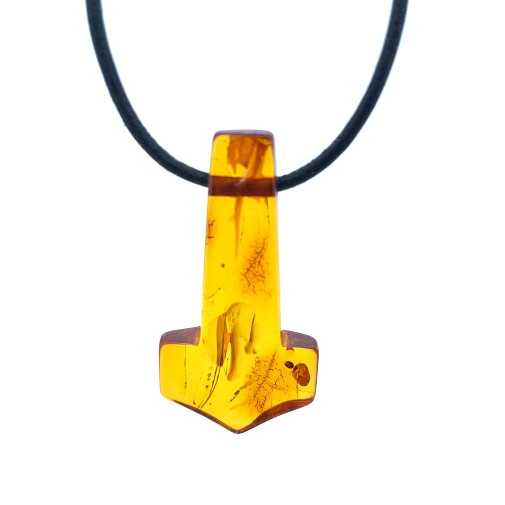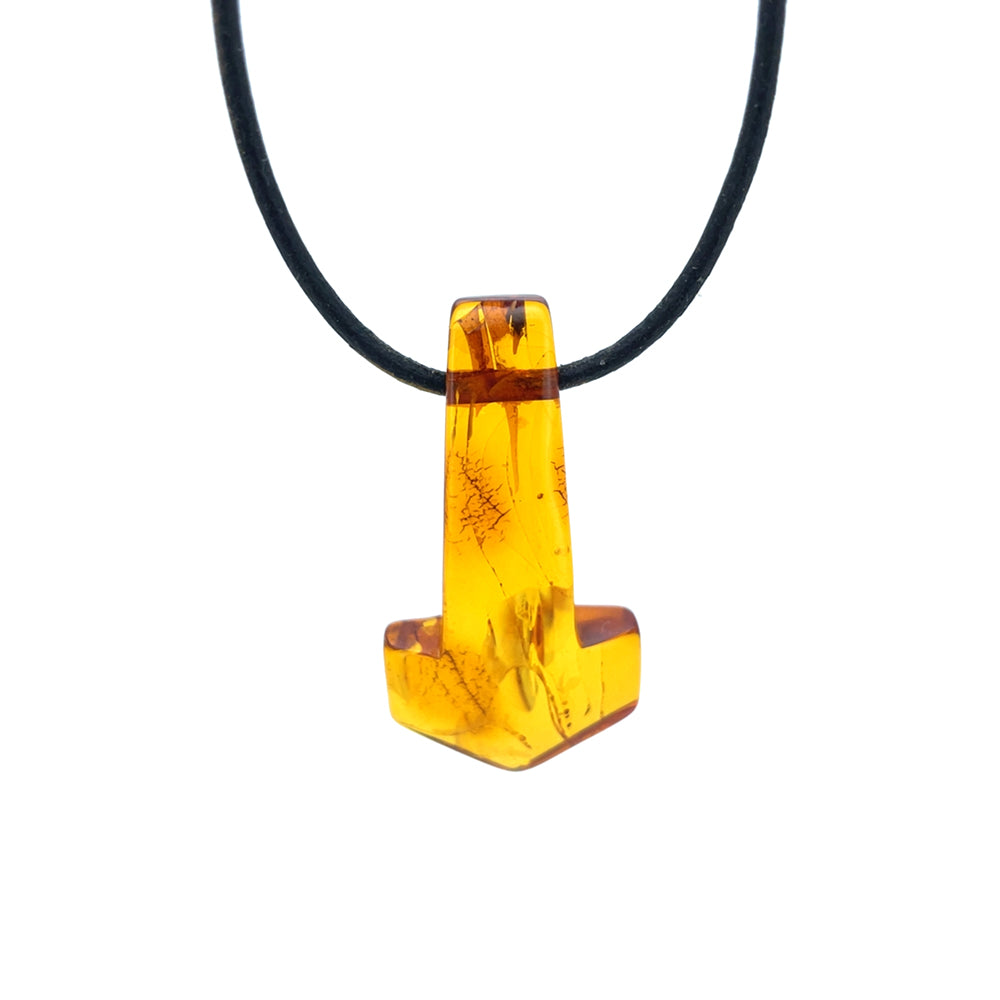 Dette enestående vedhæng er udformet som Thors Hammer og fremstillet af ægte rav. Med sin smukke glød og naturlige mønstre er det et unika, som ikke findes magen til.