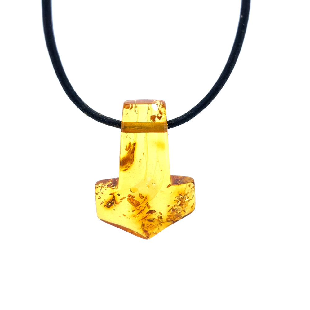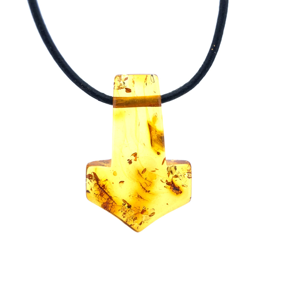 Dette enestående vedhæng er udformet som Thors Hammer og fremstillet af ægte rav. Med sin smukke glød og naturlige mønstre er det et unika, som ikke findes magen til.