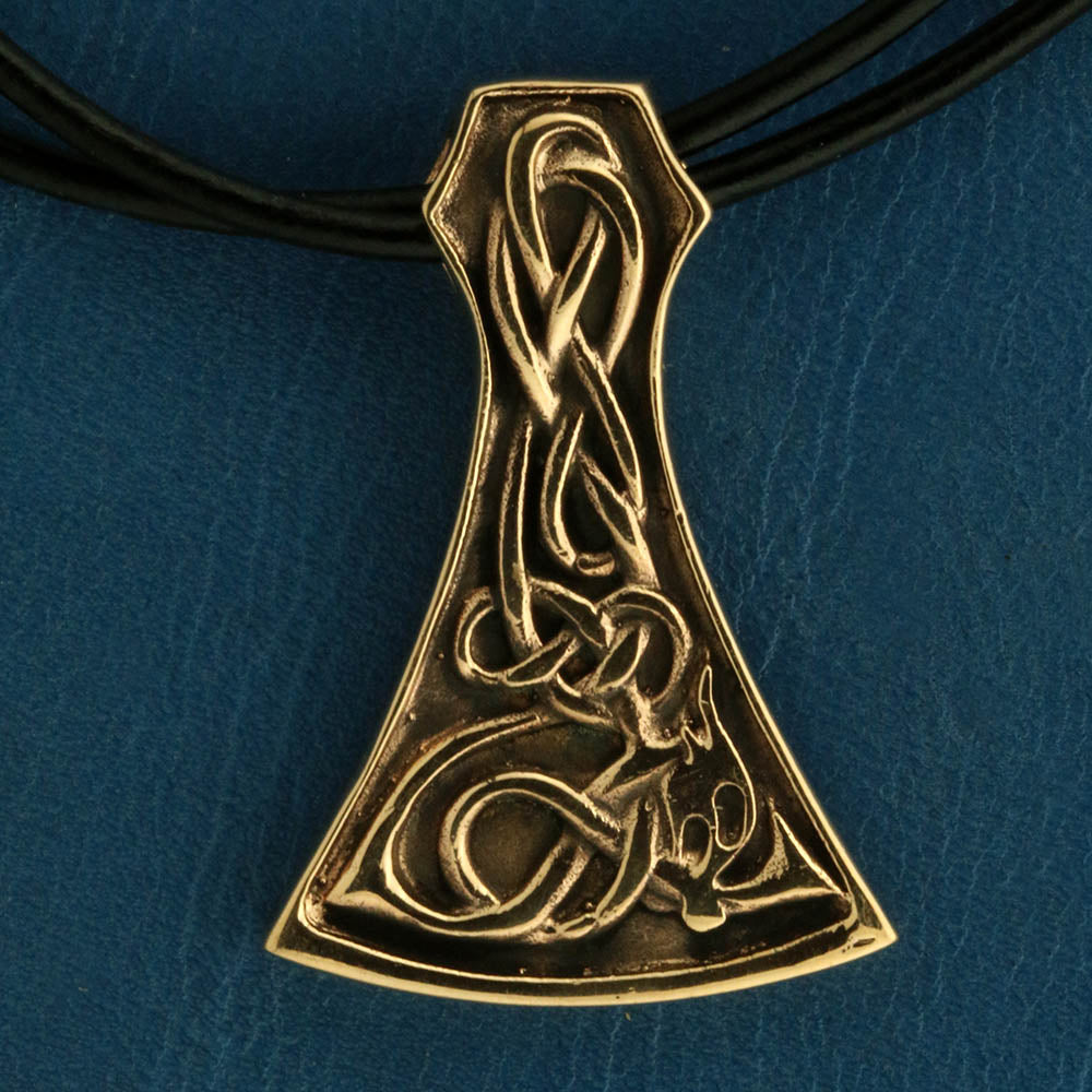 Stil og Symbolik: Det detaljerede design og dragemotivet gør denne økse til mere end bare et smykke. Den bliver en påmindelse om styrke og kraft, når du bærer den. Den diskrete læderkæde, der ledsager øksen, giver smykket et råt touch, der passer perfekt til vikingernes æra.