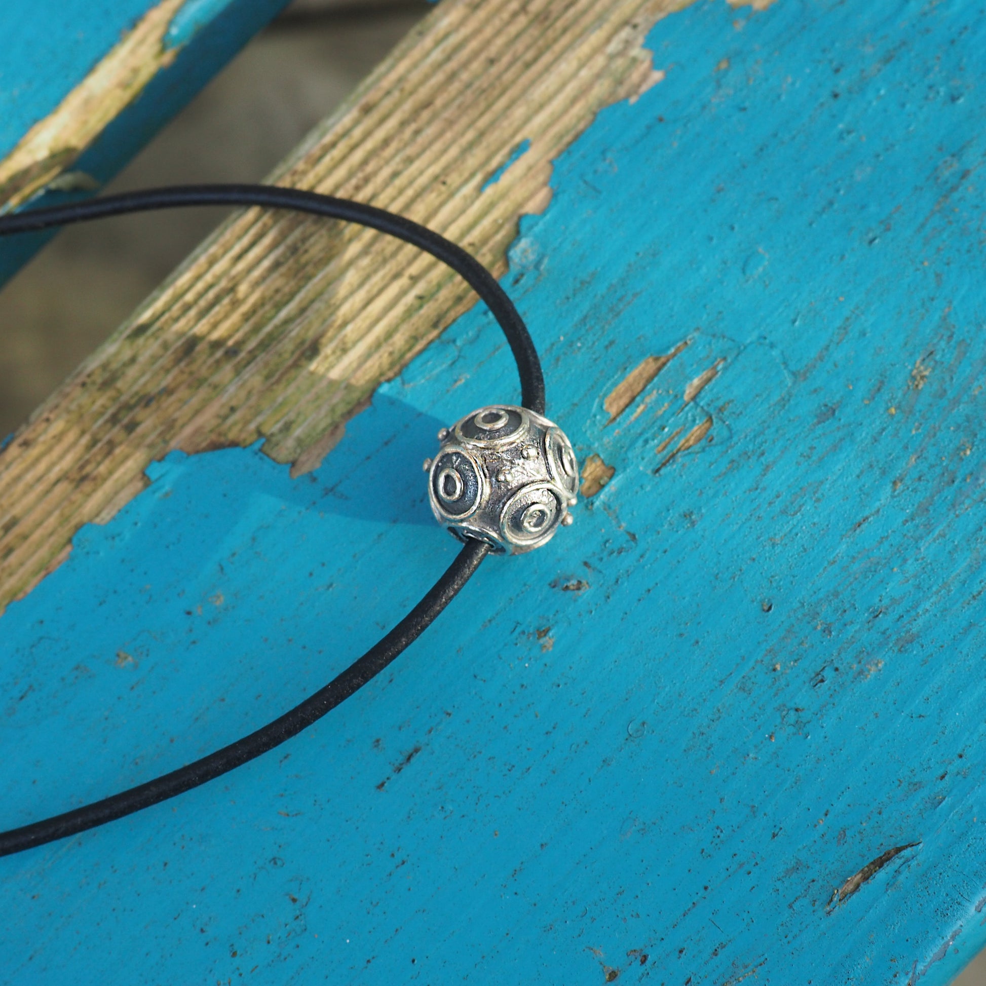 Denne smukke perle er inspireret af de autentiske vikingeperler, som blev båret både for at vise rigdom og som en form for betalingsmiddel i vikingetiden. Vikingernes perler var lavet af materialer som sølv, bronze, glas, rav og ler og blev ofte båret i lædersnore om halsen eller på kæder, som blev fastgjort ved fiblerne – elegante brocher, der holdt kjolerne sammen over skuldrene.