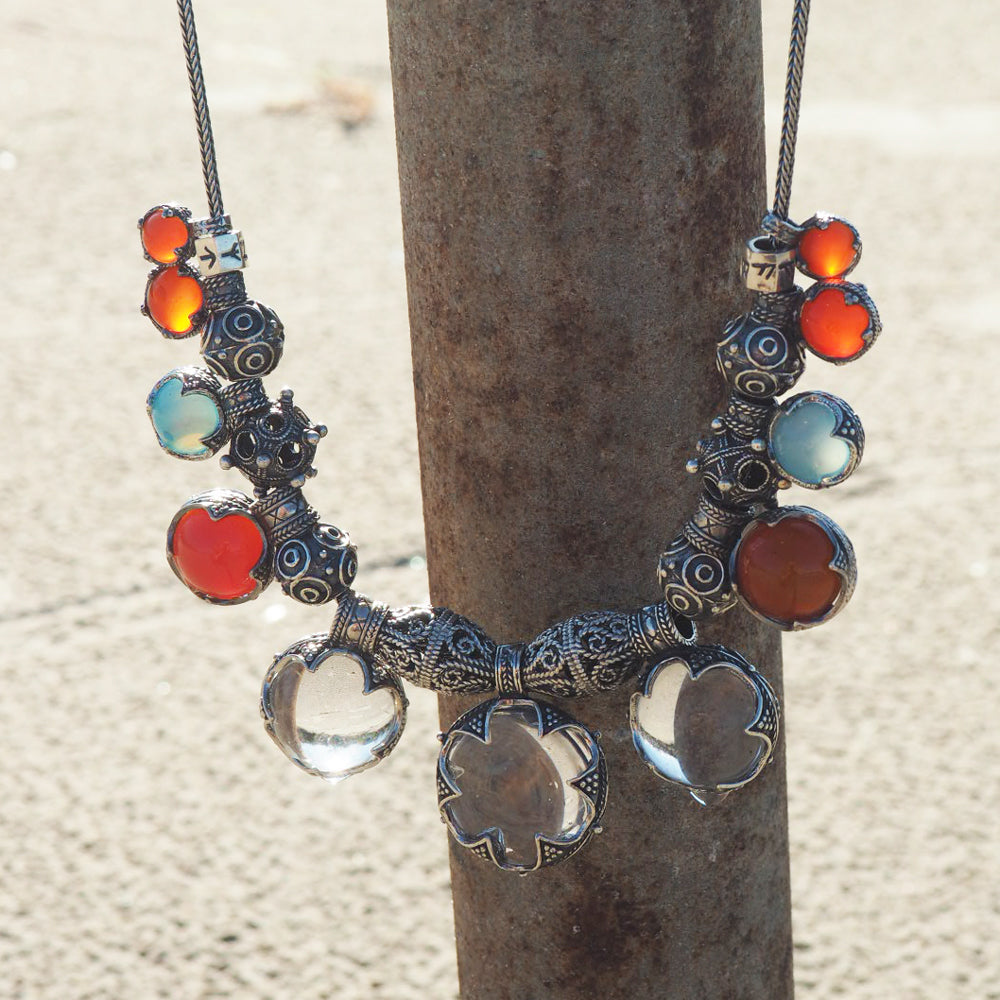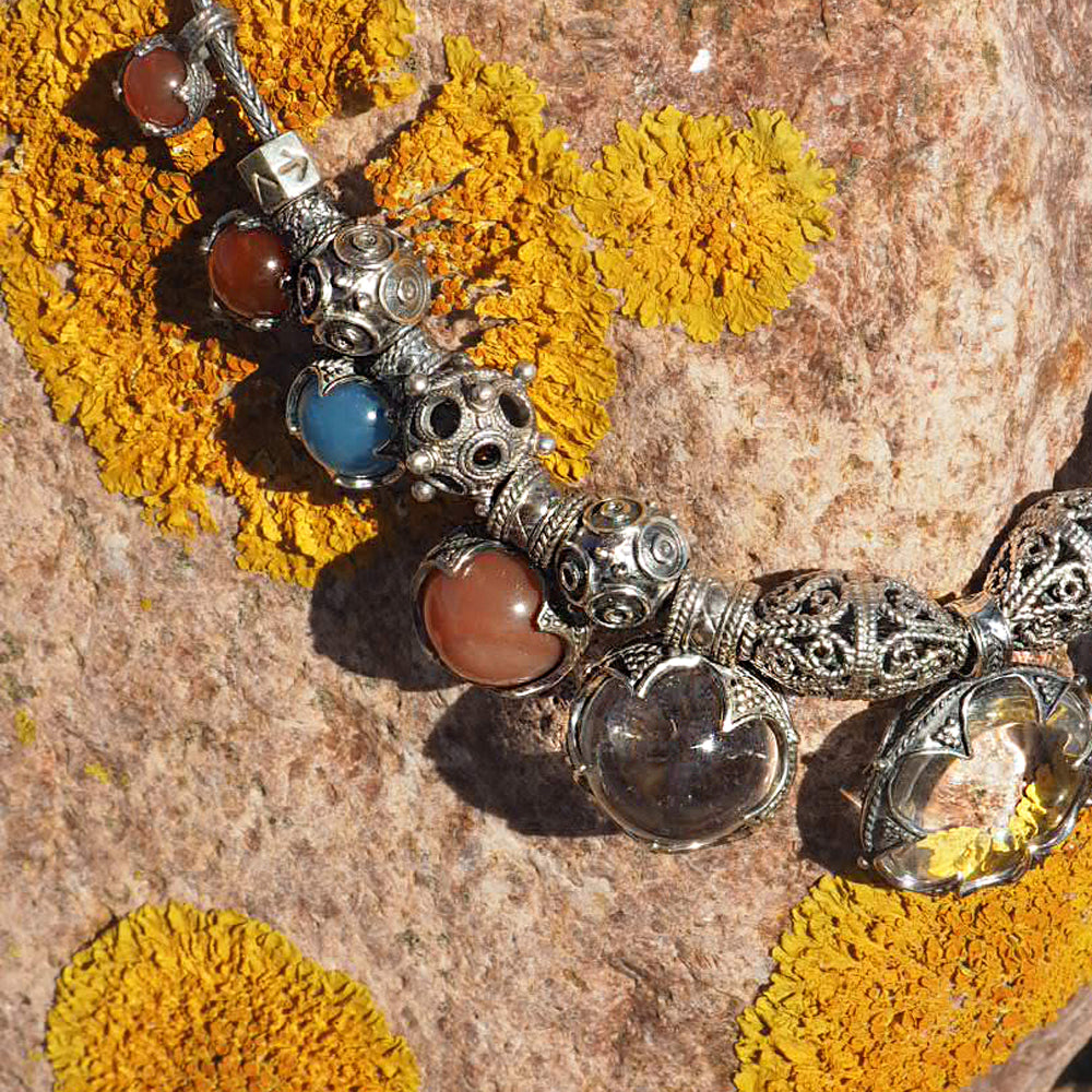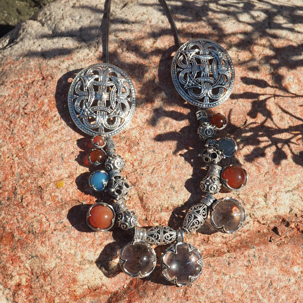 Denne vikingekæde er en enestående rekonstruktion af datidens kvinders smykker, i de mest velhavende familier i vikingetiden – skabt med respekt for fundene fra Gotland og Borre. Kæden består af to smukt udførte skånespænder fra Borre-fundet, der bærer en række unikke vedhæng. Imellem dem hænger ægte bjergkrystal, dyb blå agat og varm karneol – sten, som vikingerne satte stor pris på for deres skønhed og symbolske kraft.