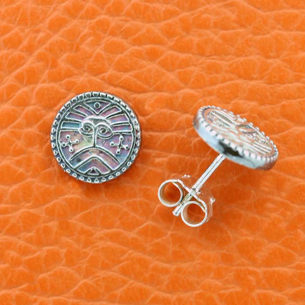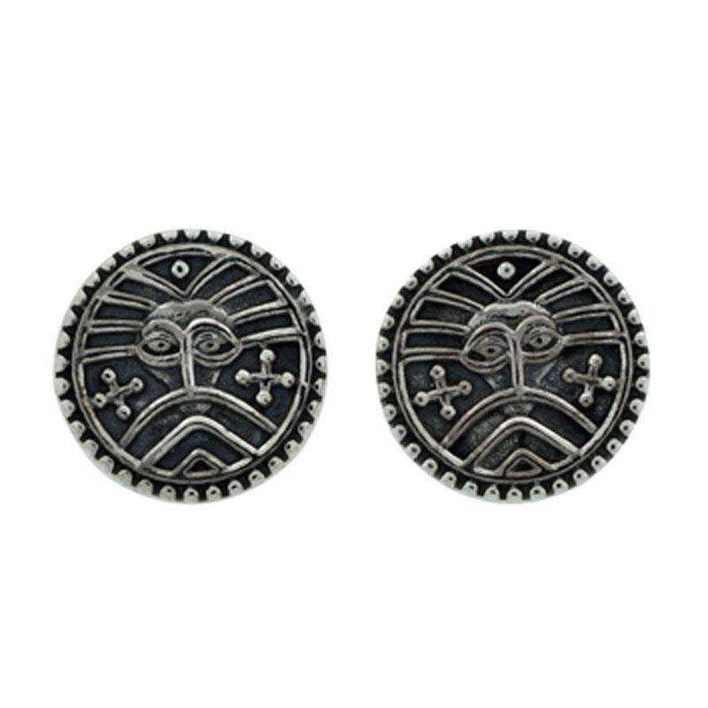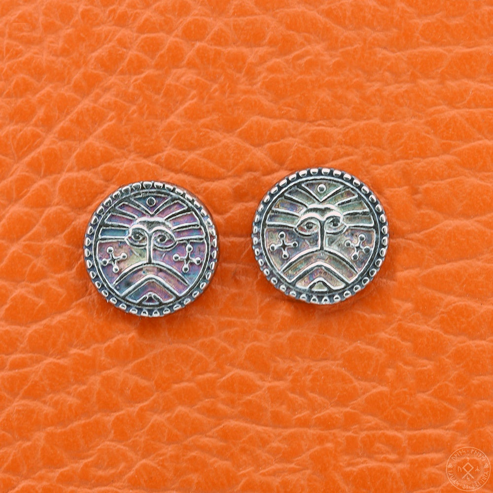 På den ene side ses en mandsmaske med strittende hår og stort skæg.