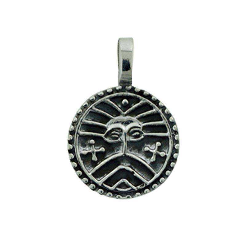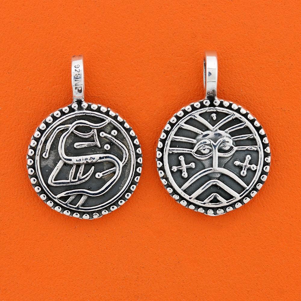 med strittende hår og stort skæg. På bagsiden ses et dyr, hvis hoved er