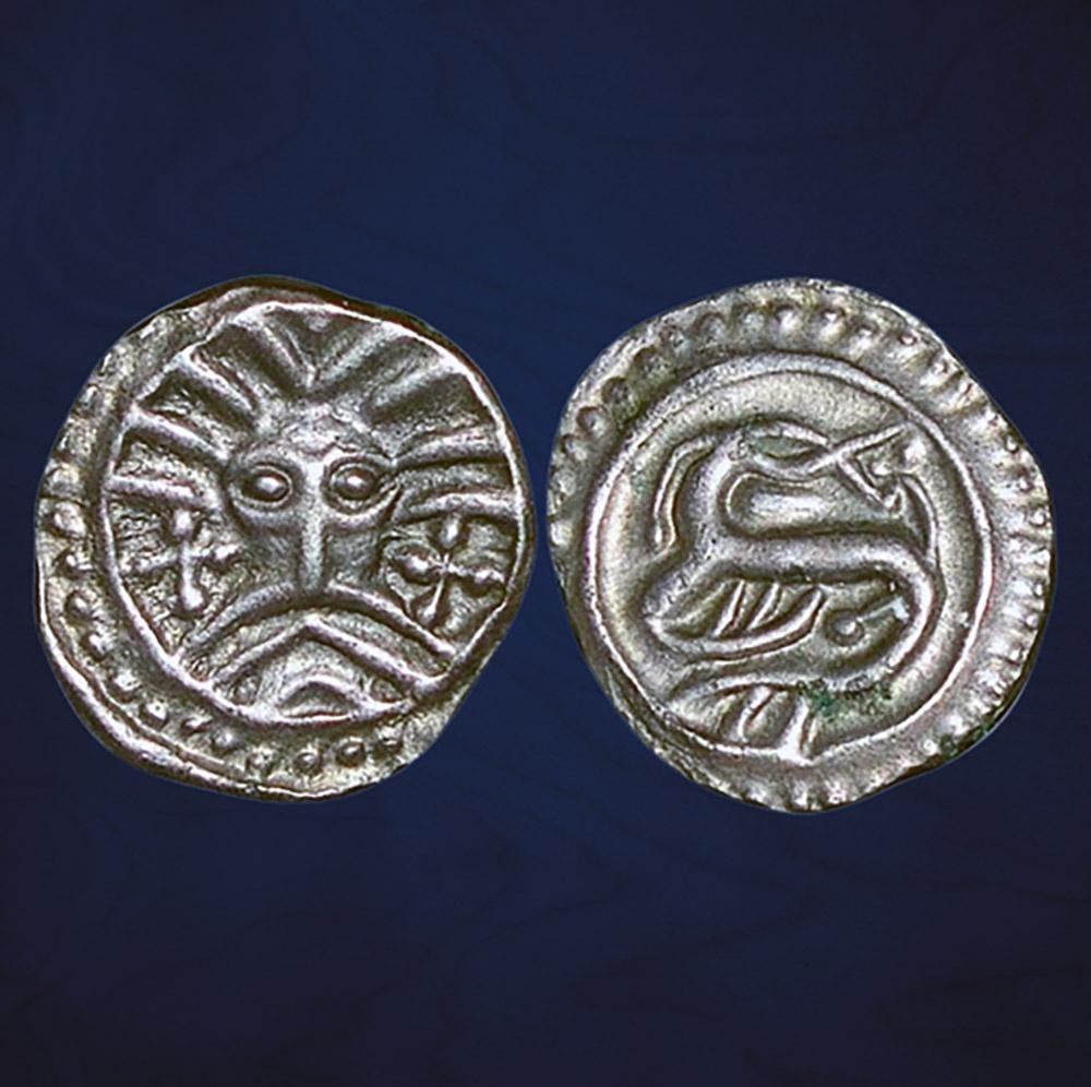 I DK er fundet 228 sølvmønter, heraf 210 i Ribe, der i 700-årene blev brugt som betalingsmiddel. Originalen er 11mm stor og vejer 1 g og er en af de ældste mønter fremstillet i DK. På den ene side ses en mandsmaske med strittende hår og stort skæg. På bagsiden ses et dyr, hvis hoved er bøjet bagover ryggen og som bider i sin egen hale.